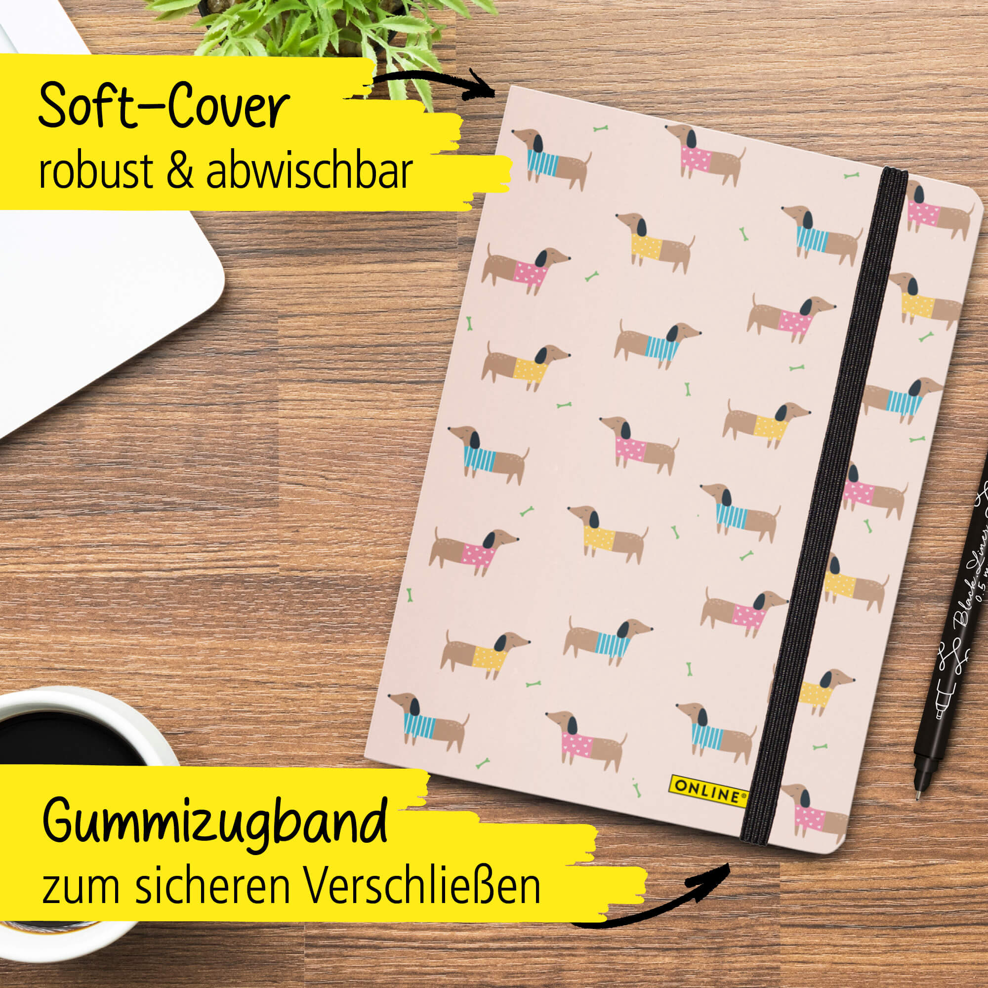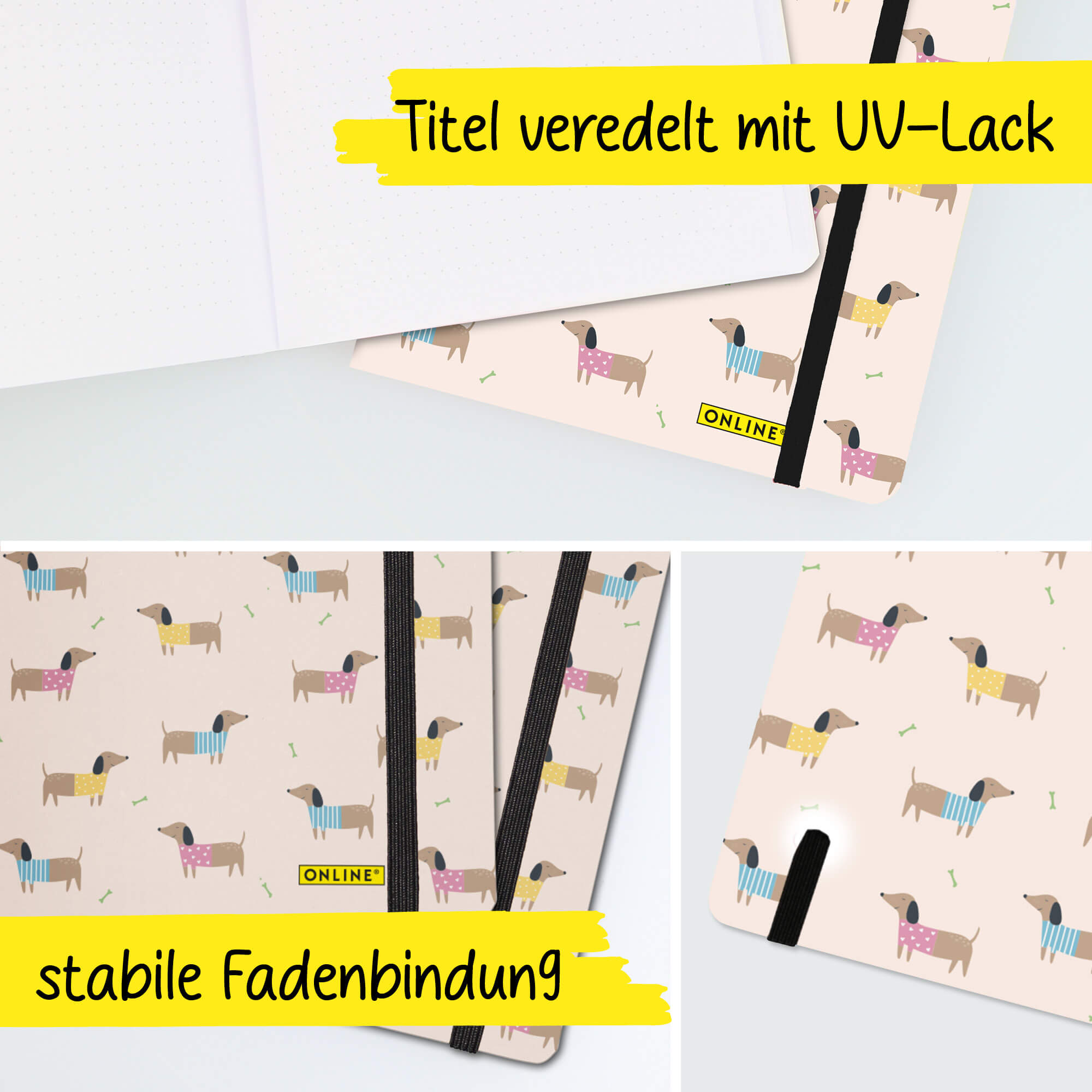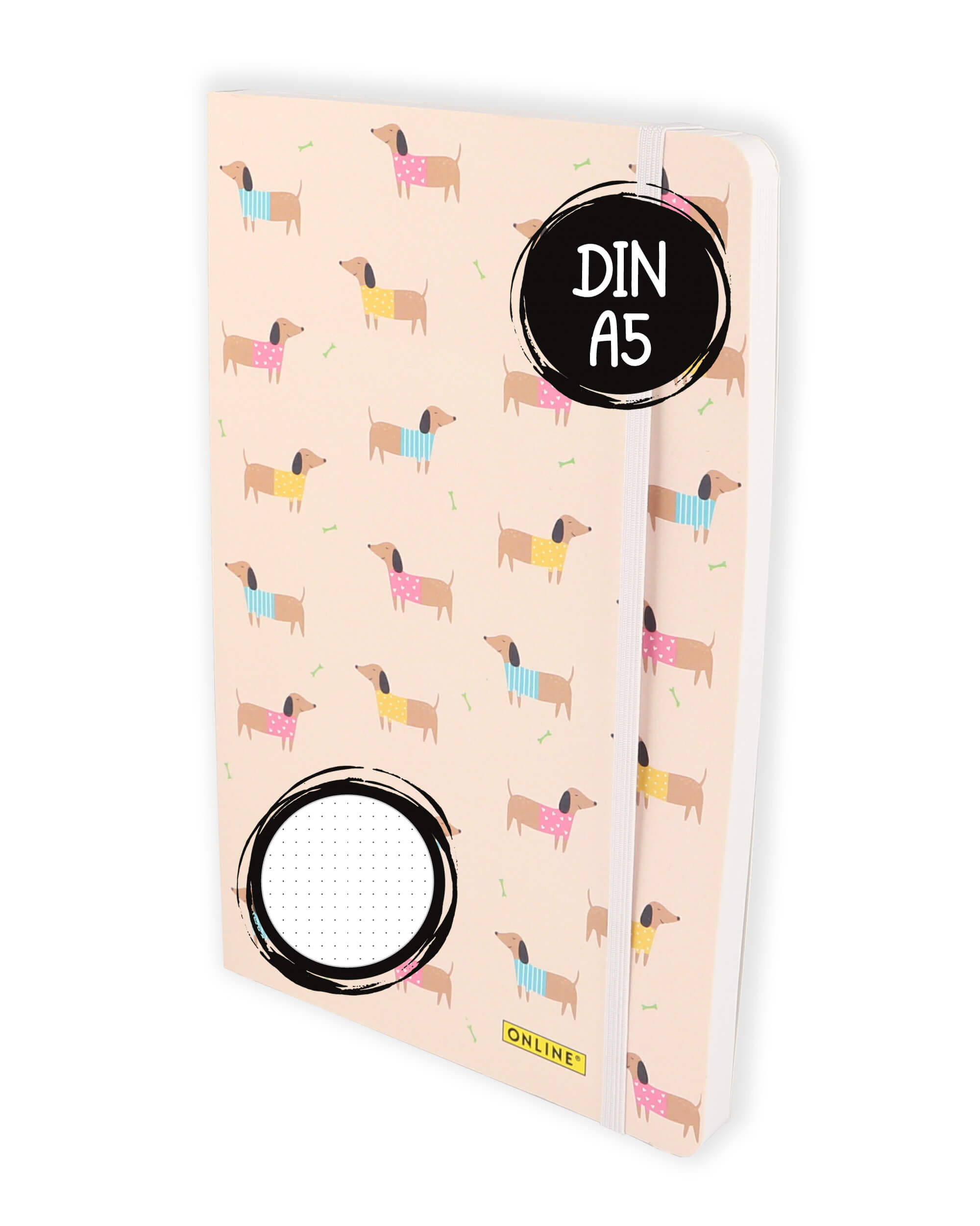 Bullet Journal Dackel, Dotted-Notizbuch mit Soft Cover, Gummiband, DIN A5, 120g/m² FSC Papier, 144 Seiten