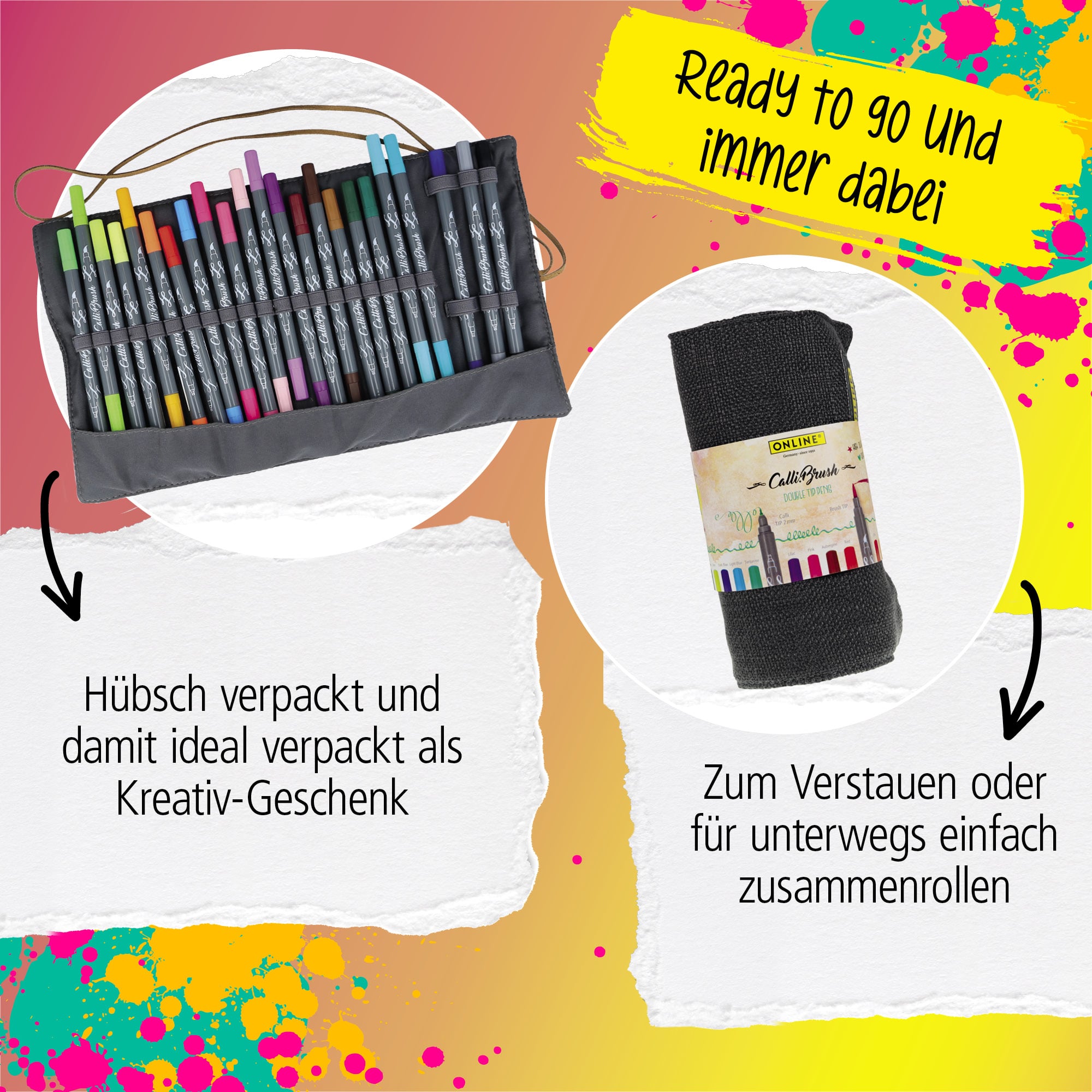 Die Pen Roll ist gefüllt mit 24 Calli.Brush Pens fürs kreative Schreiben. Damit wächst die Lust am kreativen Tun rund ums Schreiben, Handlettering oder vielen weiteren Möglichkeiten. Ideen kreieren und in die wunderbare Welt des Handgemachten eintauchen: diese Double Tip Pens machen es möglich! Die Kombination der dünnen, abgeschrägten Kalligrafie-Spitze mit der breiten Pinselspitze garantiert eine vielfältige und kreative Gestaltung, damit das von Hand Erschaffene eine besondere Wertschätzung erlebt. Die Calli.Brush Pens sind gut für Einsteiger geeignet.