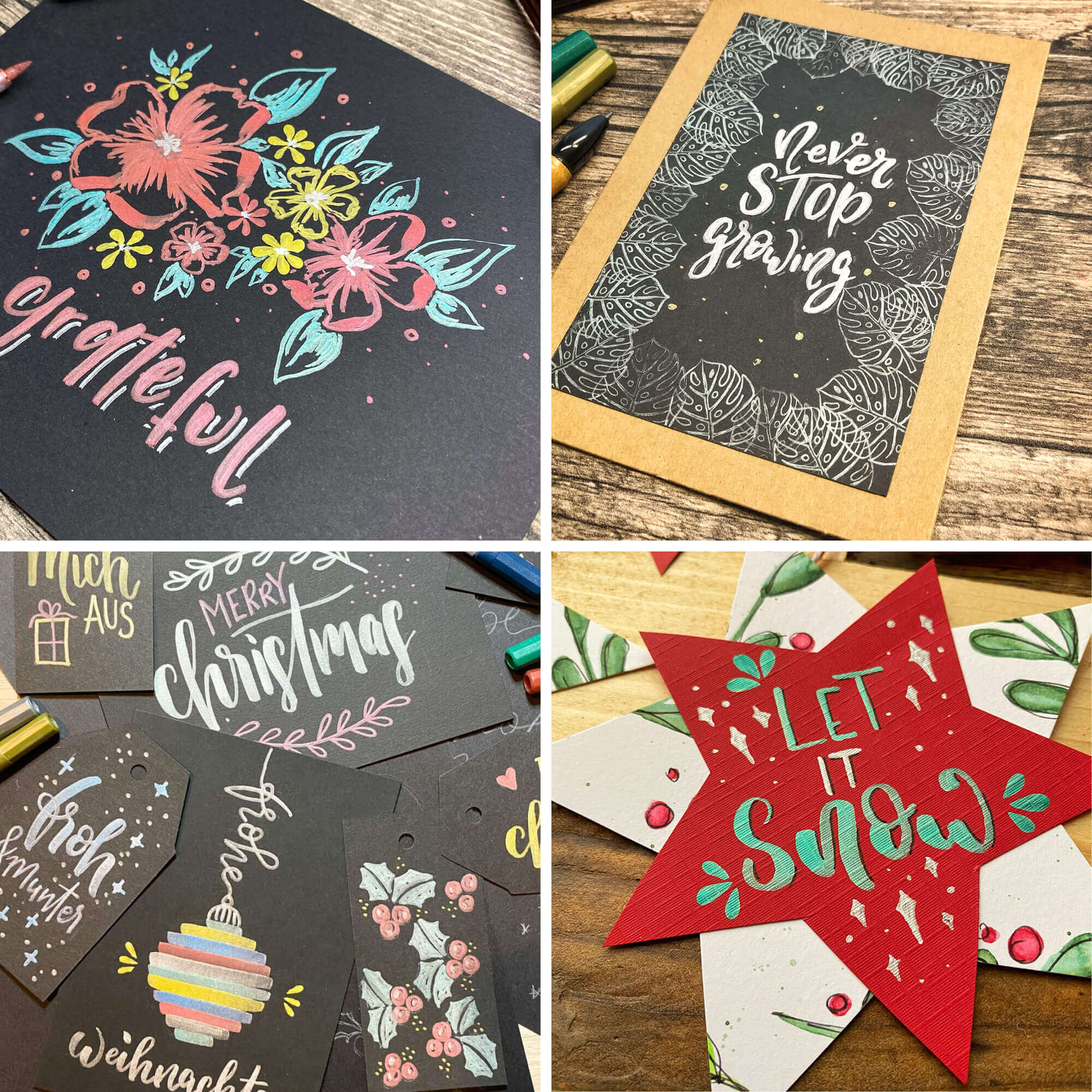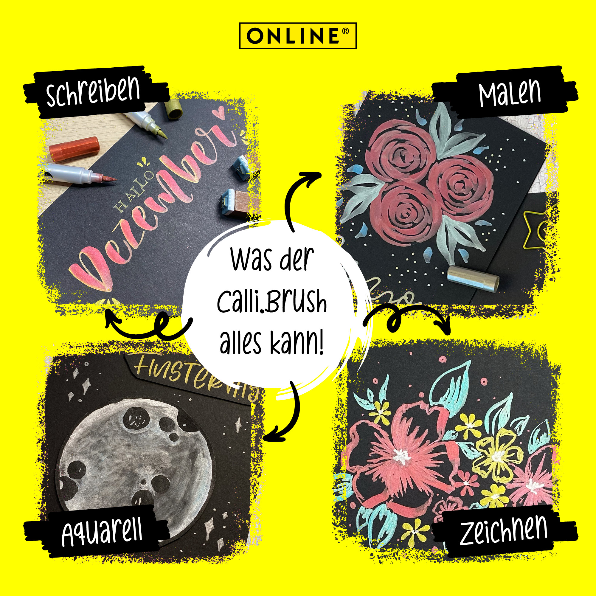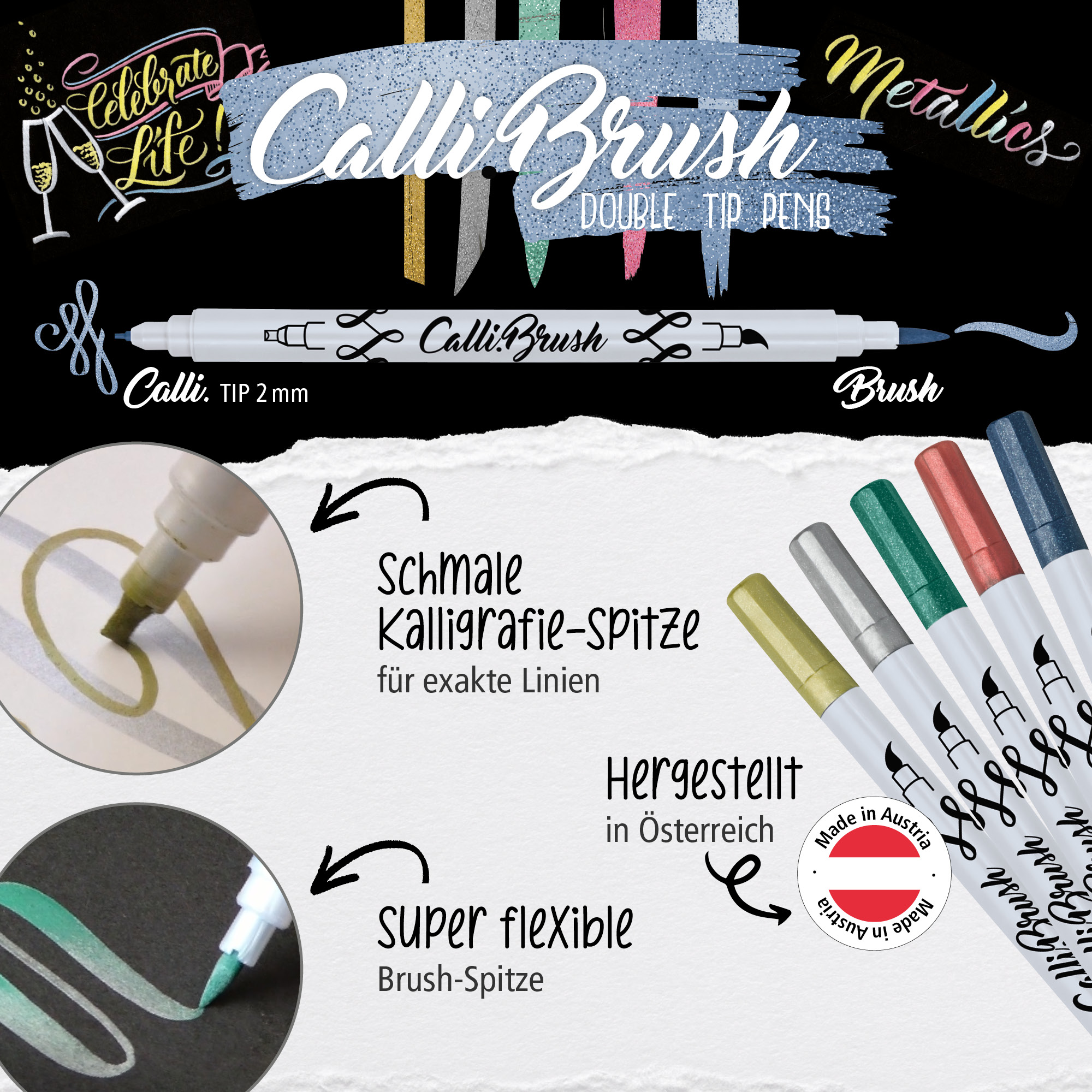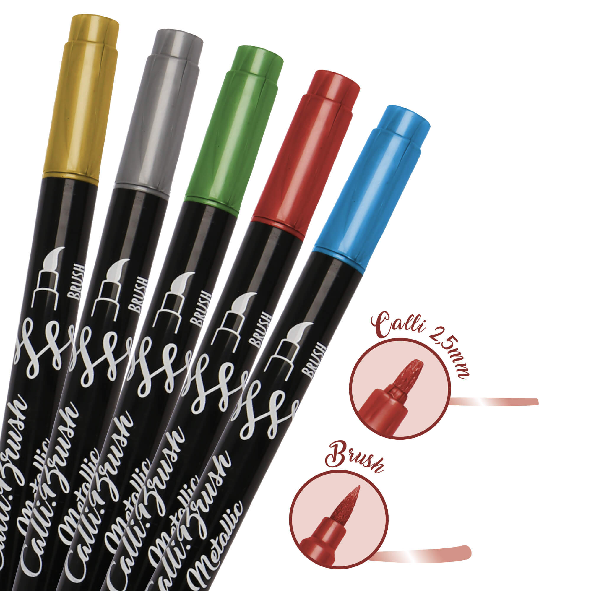 Die Calli.Brush Double Tip Brushpens Metallic sind besonders gut für dunkle Papiere geeignet. In Sachen Qualität überzeugend auf ganzer Linie: intensiv pigmentierte Farben und zwei langlebige Künstlerspitzen. Die 2,5 mm Kalligrafie-Spitze und die biegsame Pinselspitze erlauben eine große Vielfalt an Schriftbreiten und -varianten mit zahlreichen Gestaltungsmöglichkeiten. Die fünf Metallicfarben entfalten ihre schimmernde Wirkung besonders gut auf dunklen Papieren: Mit den perfekt aufeinander abgestimmten Farbtönen Metallic Gold, Metallic Silver, Metallic Green Metallic Red, Metallic Blue lässt sich kreativ arbeiten und kombinieren. Die Calli.Brush Pens sind gut für Einsteiger geeignet.