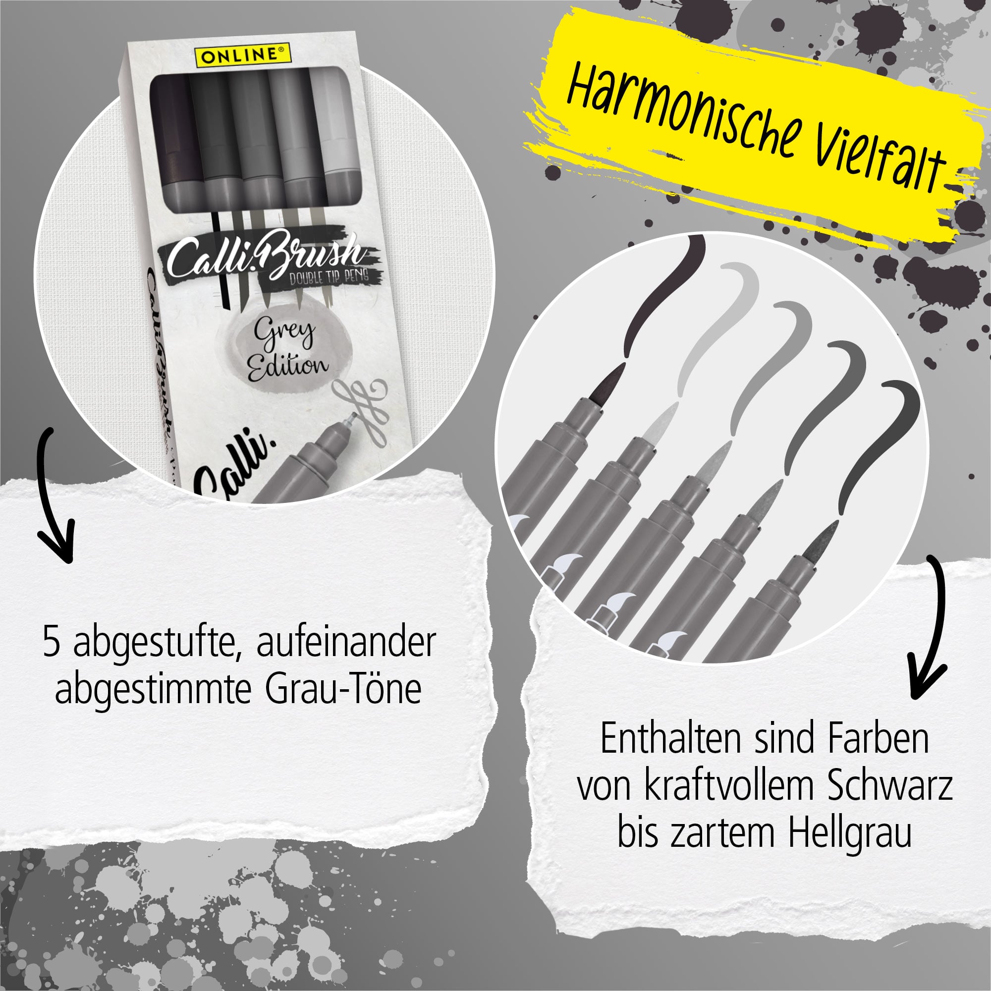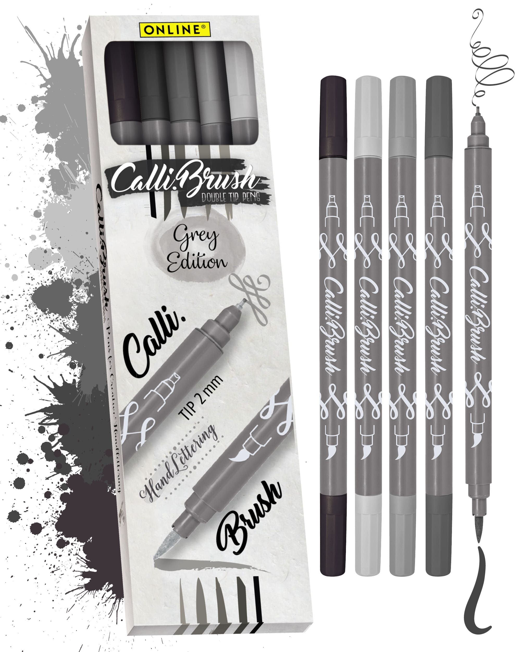 Bunt ist farbenfroh, das Grau schafft Kontraste. In der Grey Edition kommt der Calli.Brush in fünf fein abgestuften Tönen – vom kraftvoll deckenden Schwarz bis zum lasierenden, noblen Hellgrau. Was sich wunderbar kombinieren lässt. Damit wächst die Lust am kunstvollen Schreiben, Handlettering, Zeichnen und Malen von Buchstaben. Mit diesen Watercolor Brush Pens genügt nur ein Stück Papier und ein bisschen Zei für sich. Für kreatives Schreiben und Gestalten, z.B. von Postkarten, Grußkarten für die Hochzeit oder Geburtstage. Ideen kreieren und in die wunderbare Welt des Handgemachten eintauchen: diese Brush Pens machen es möglich! Die Kombination der dünnen Kalligrafie-Spitze mit der breiten Pinselspitze garantiert eine vielfältige und kreative Gestaltung.