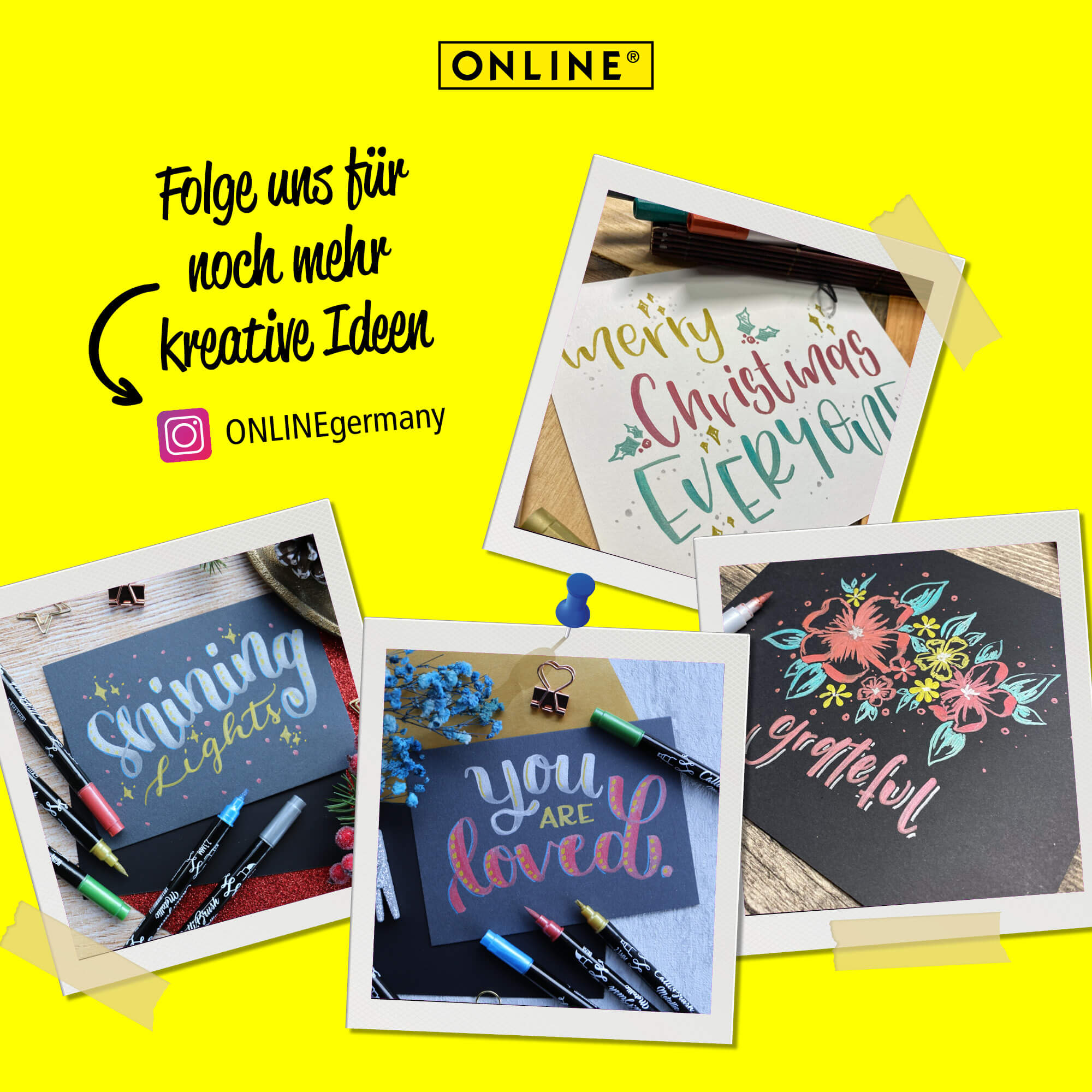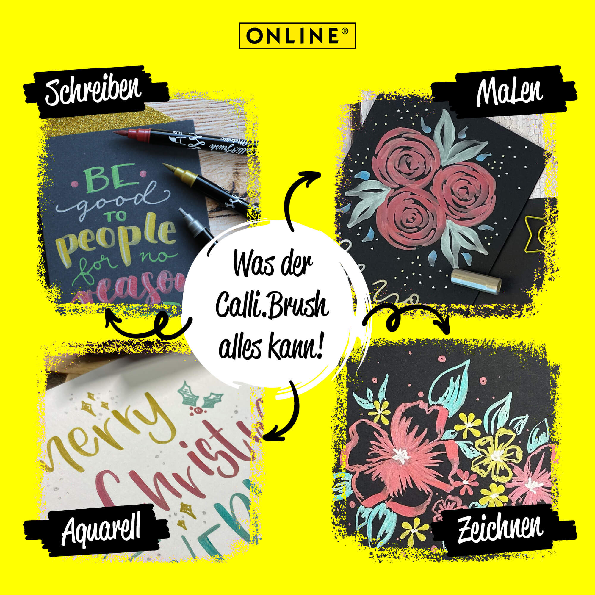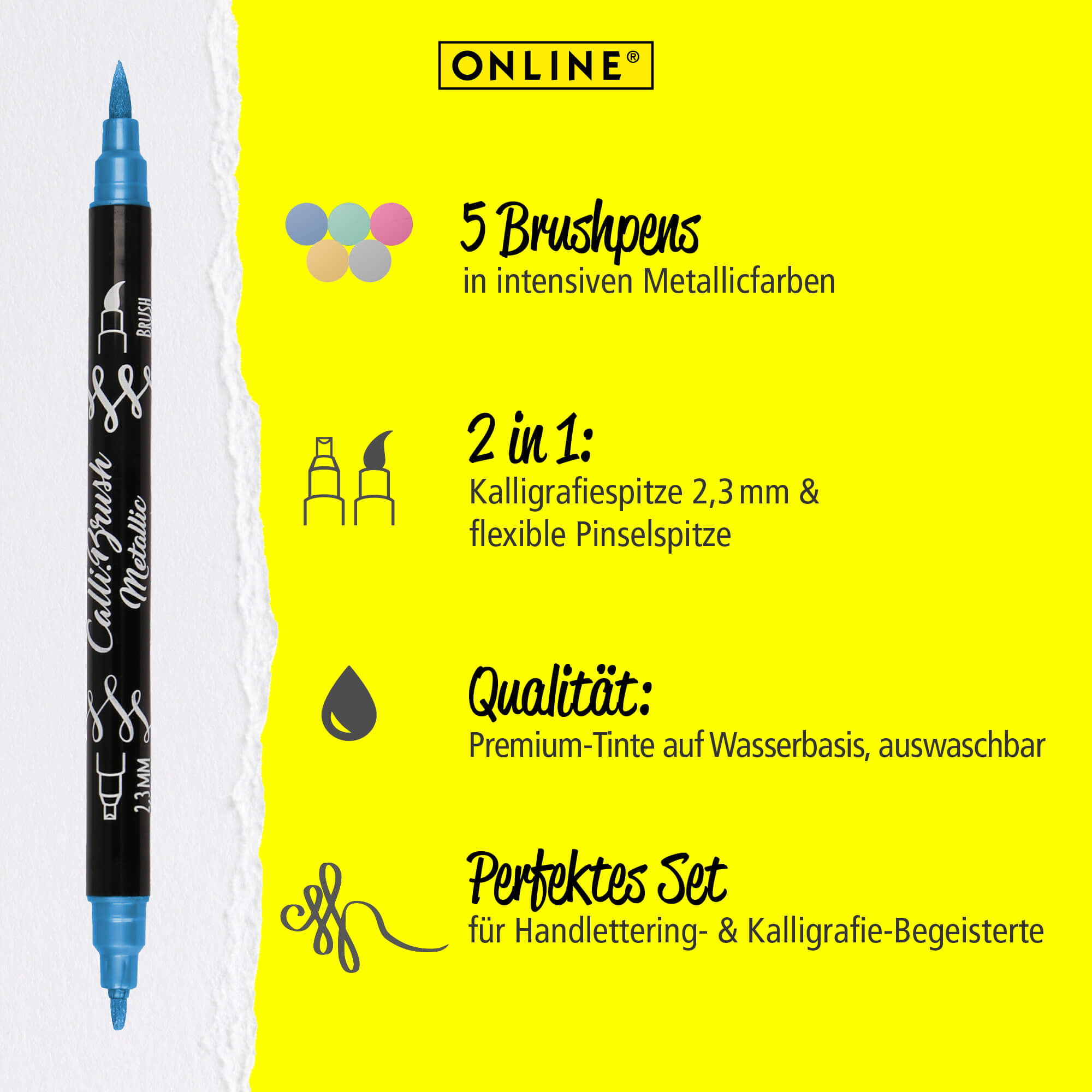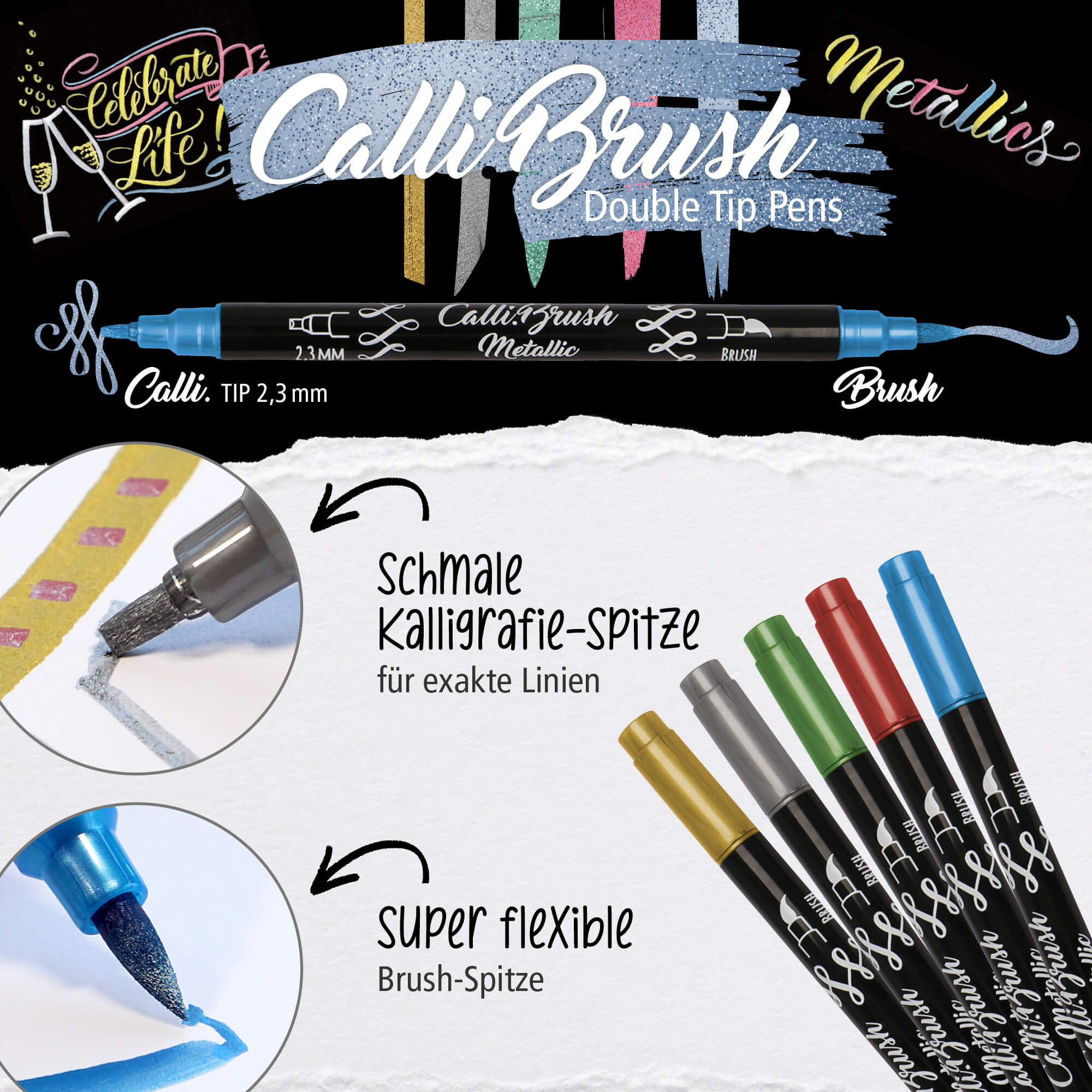 Die Calli.Brush Double Tip Brushpens Metallic sind besonders gut für dunkle Papiere geeignet. In Sachen Qualität überzeugend auf ganzer Linie: intensiv pigmentierte Farben und zwei langlebige Künstlerspitzen. Die 2,3 mm Kalligrafie-Spitze und die biegsame Pinselspitze erlauben eine große Vielfalt an Schriftbreiten und -varianten mit zahlreichen Gestaltungsmöglichkeiten.