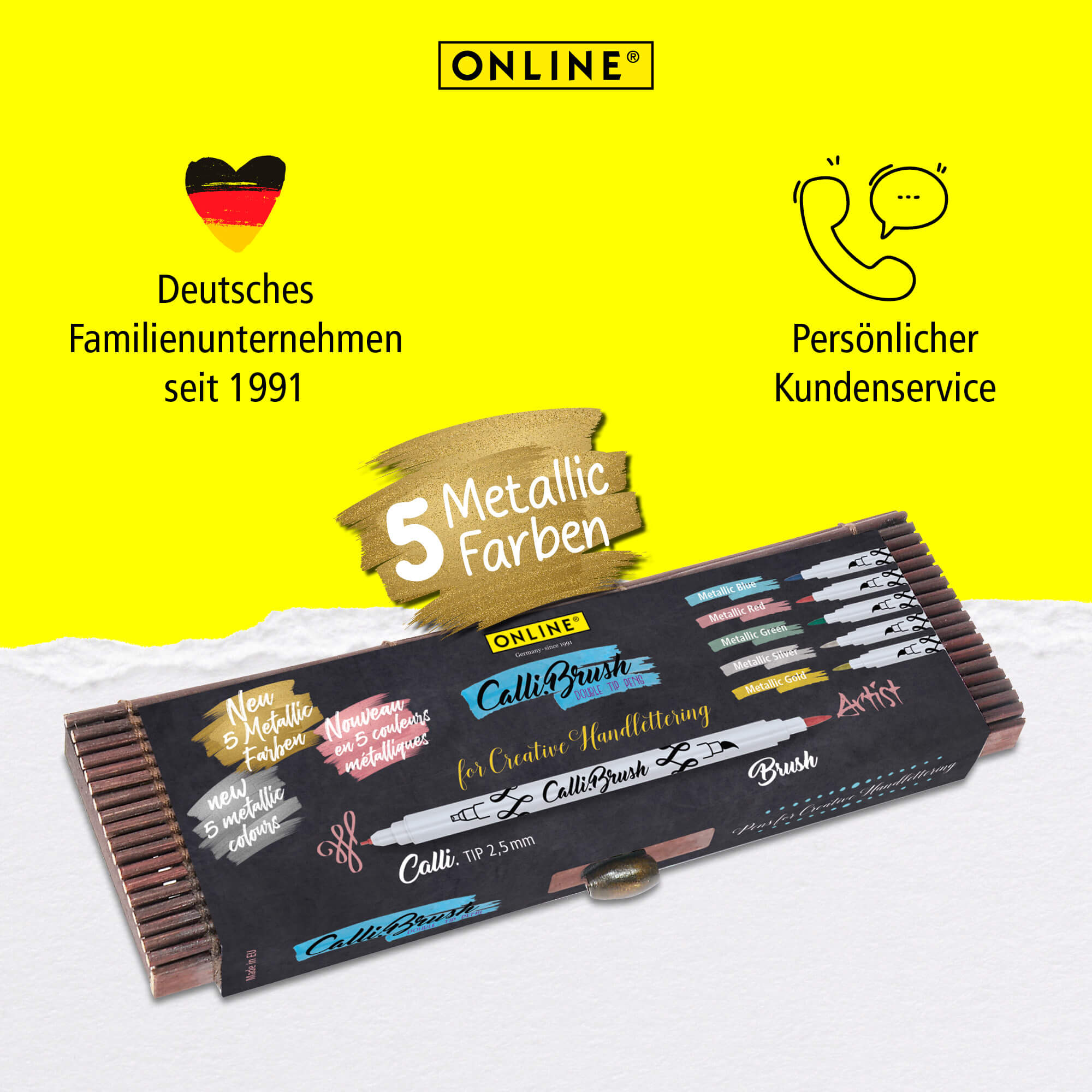 Die fünf Metallicfarben entfalten ihre schimmernde Wirkung besonders gut auf dunklen Papieren: Mit den perfekt aufeinander abgestimmten Farbtönen Metallic Gold, Metallic Silver, Metallic Green Metallic Red, Metallic Blue lässt sich kreativ arbeiten und kombinieren. Die Calli.Brush Pens sind gut für Einsteiger geeignet.