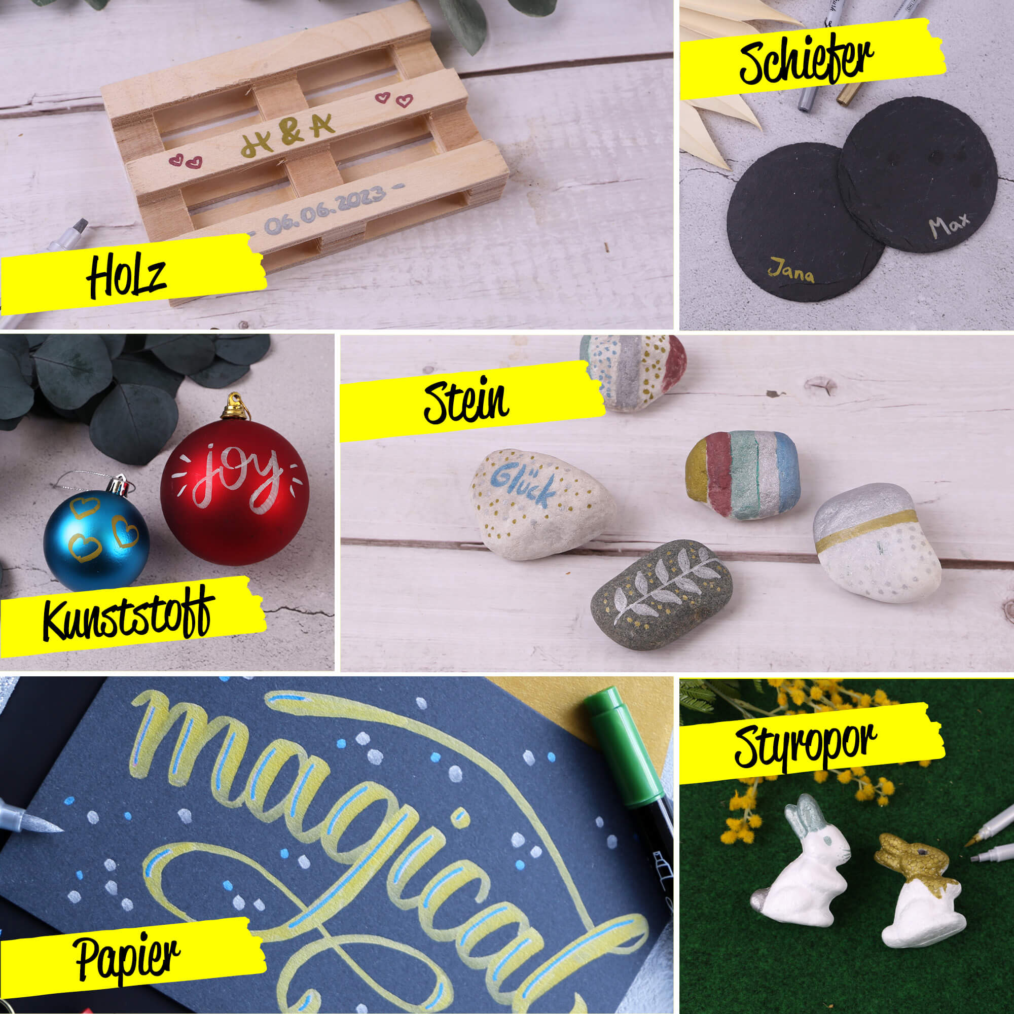 In der nachhaltigen Bamboo-Box sind sie nicht nur gut aufgehoben, sondern auch ideal zum Verschenken. Benutzbar auf den verschiedensten Oberflächen wie Porzellan, Glas und Holz zur kreativen Verschönerung. Die Stifte sind dank ungiftigen Pigmenten und Tinte auf Wasserbasis komplett ungiftig und bedenkenlos verwendbar auch für Kinder. Ideal für helles und dunkles Papier. Stifte horizontal lagern. Set mit 5 Farben.