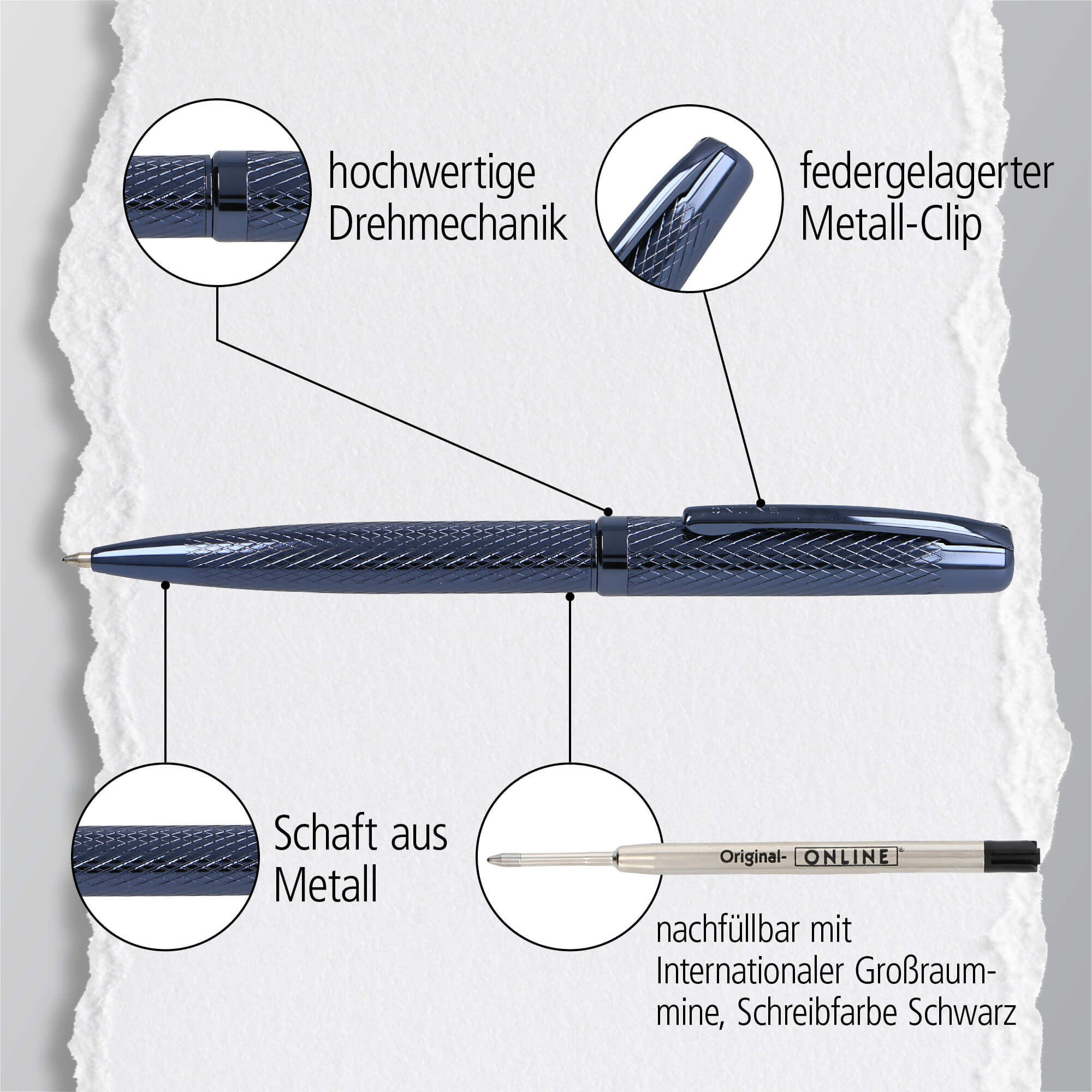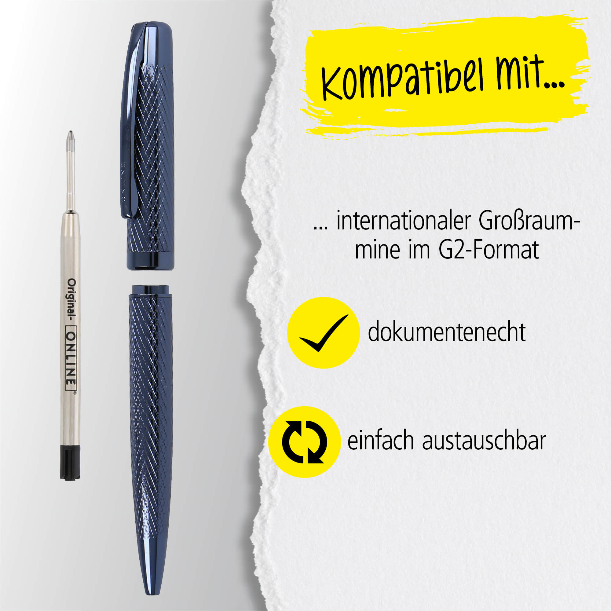 Ausgestattet mit der ONLINE Großraummine, schreibt der Eleganza Diamond Night besonders weich und hält lange. Jeder Strich gleitet sanft über das Papier – ideal für Notizen, Briefe oder wichtige Dokumente. Dank der hohen Qualität wirst Du lange Freude an diesem Kugelschreiber haben.
