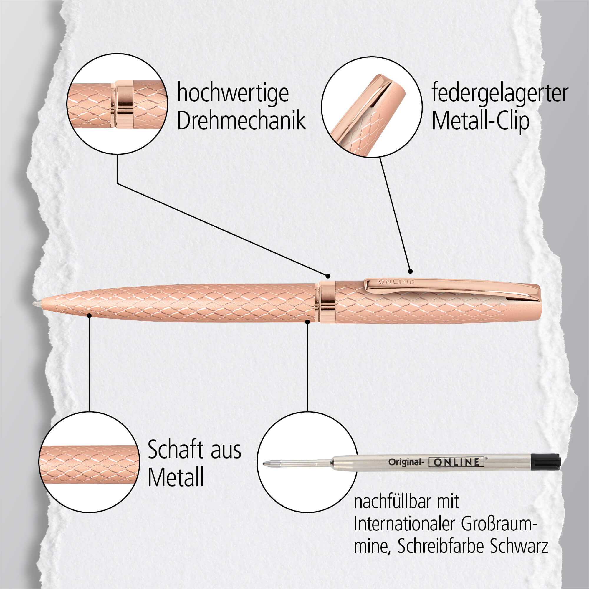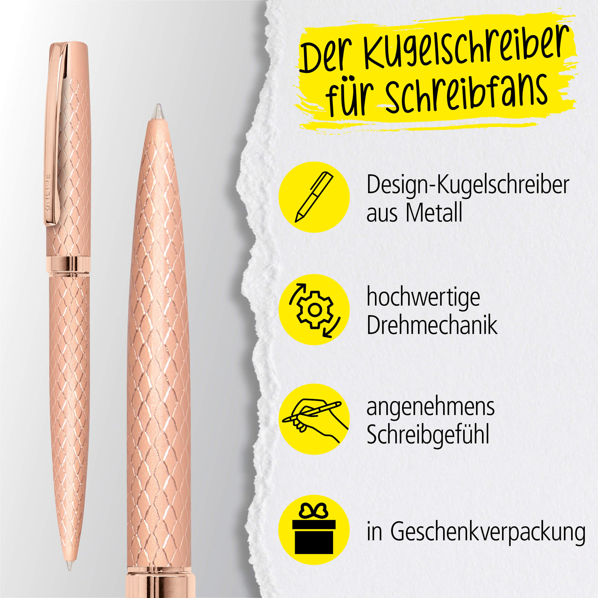 Der Design-Metall-Kugelschreiber von ONLINE, mit Großraummine in der Schreibfarbe Schwarz bietet höchsten Schreibkomfort. Im hübschen Geschenketui ist jedes dieser Schreibgeräte eine elegante Geschenkidee.