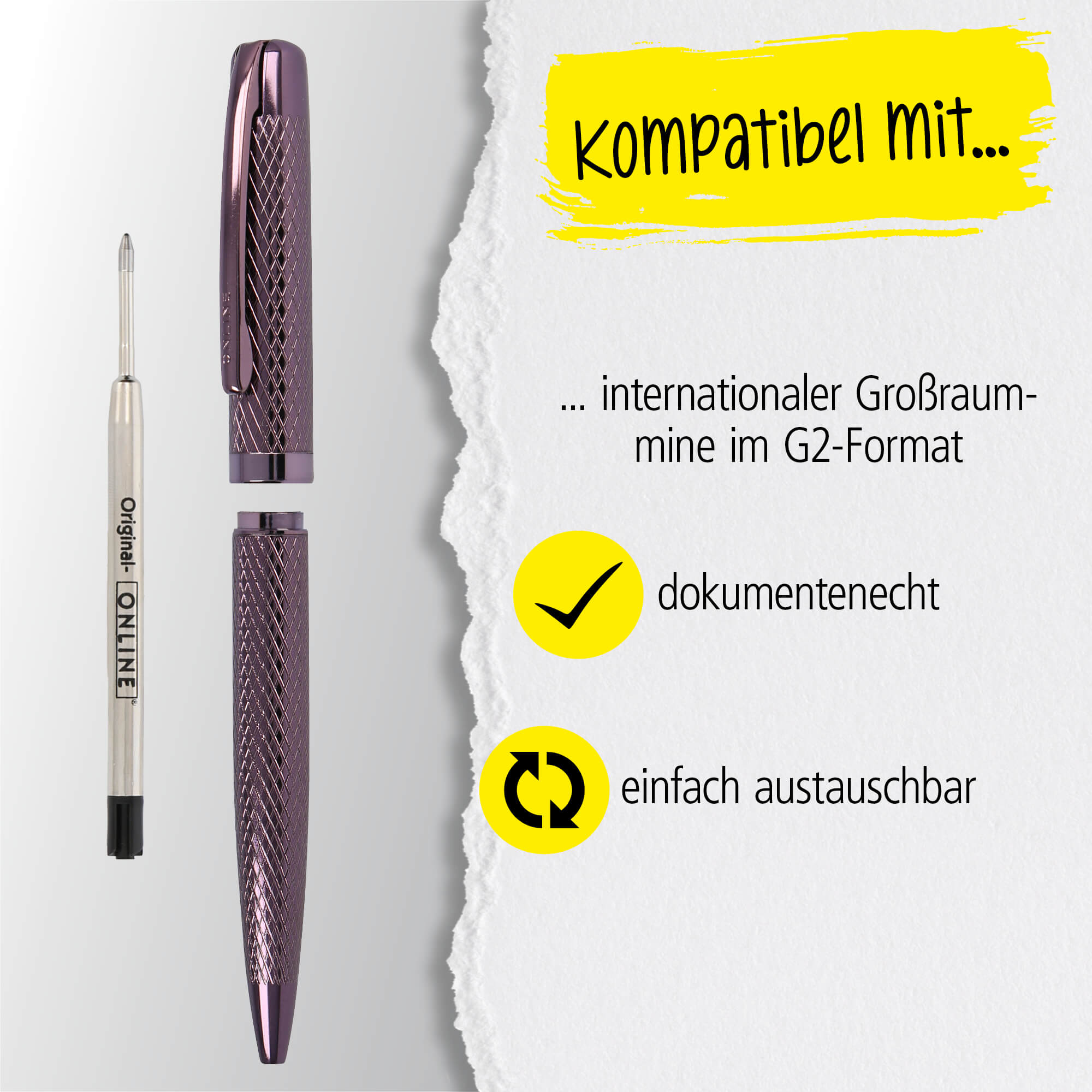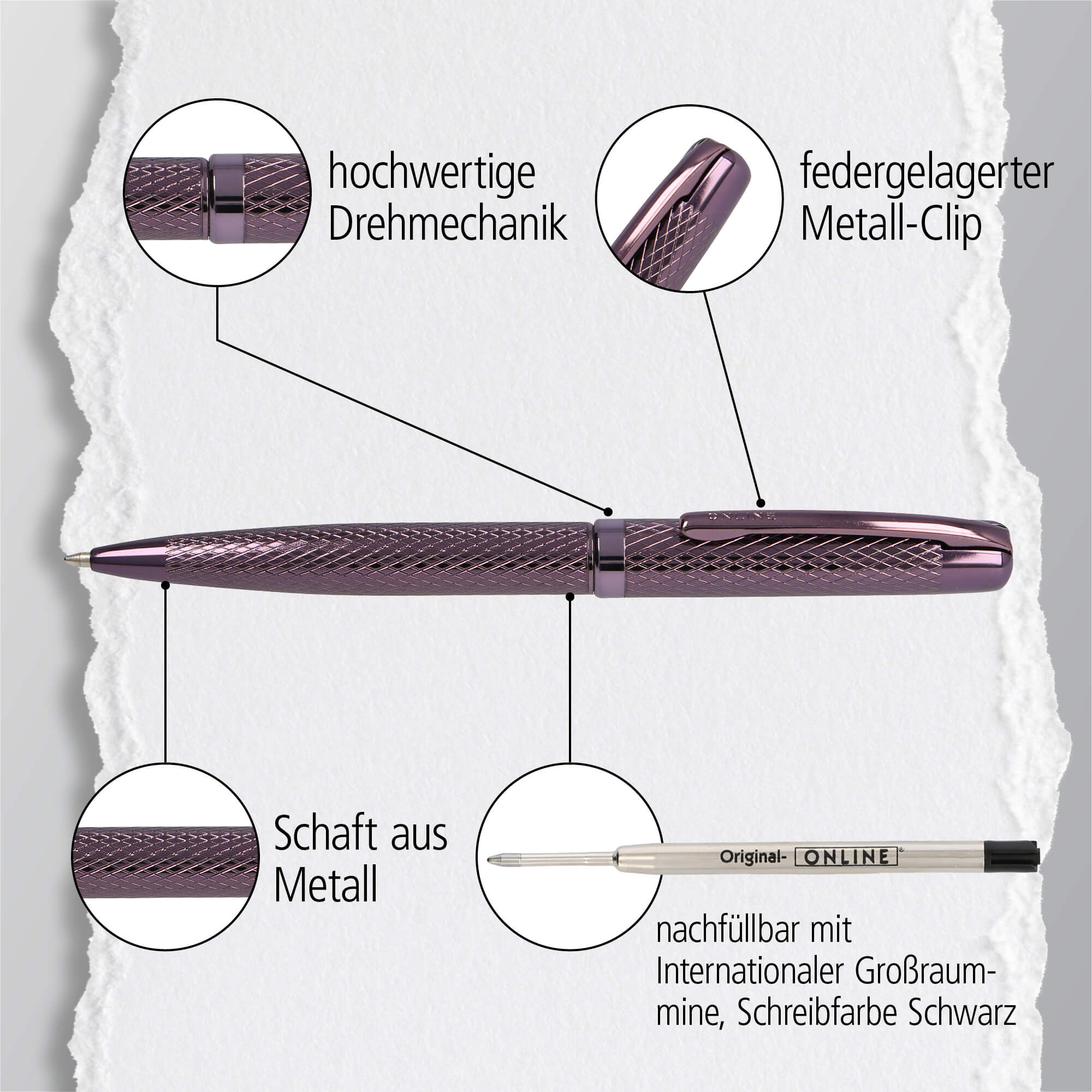 Der Körper des Eleganza Diamond Wine besteht aus hochwertigem Aluminium, das ihn leicht und gleichzeitig robust macht. Ausgestattet mit der bewährten ONLINE Großraummine sorgt der Kugelschreiber für ein flüssiges und gleichmäßiges Schreibgefühl. Ob für alltägliche Notizen, im Büro oder bei wichtigen Unterschriften – dieser Kugelschreiber ist Dein perfekter Begleiter.
