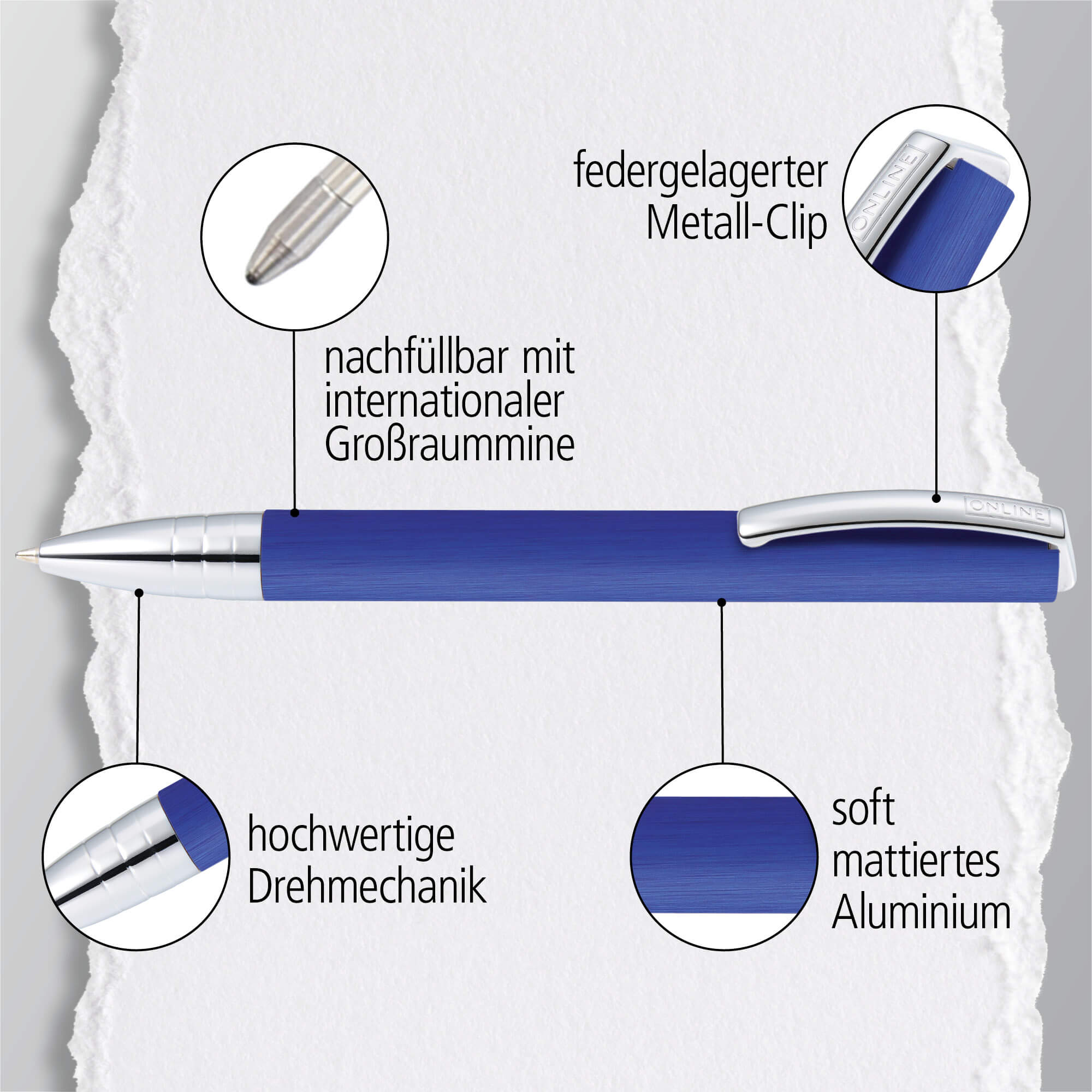 - SCHLICHTE ELEGANZ: Der ONLINE Vision Kugelschreiber besticht durch sein hochwertiges, schlichtes Erscheinungsbild, seine robuste Aluminium-Oberfläche und einen federgelagerten Metall-Clip – seriös und optimal für die Uni oder das Büro.
