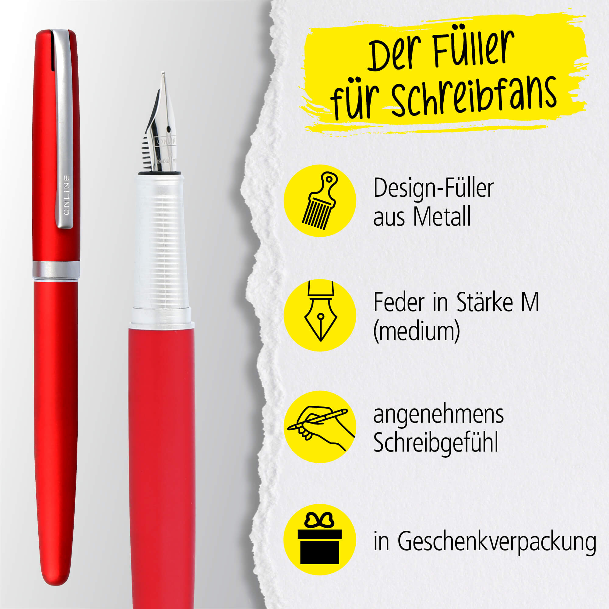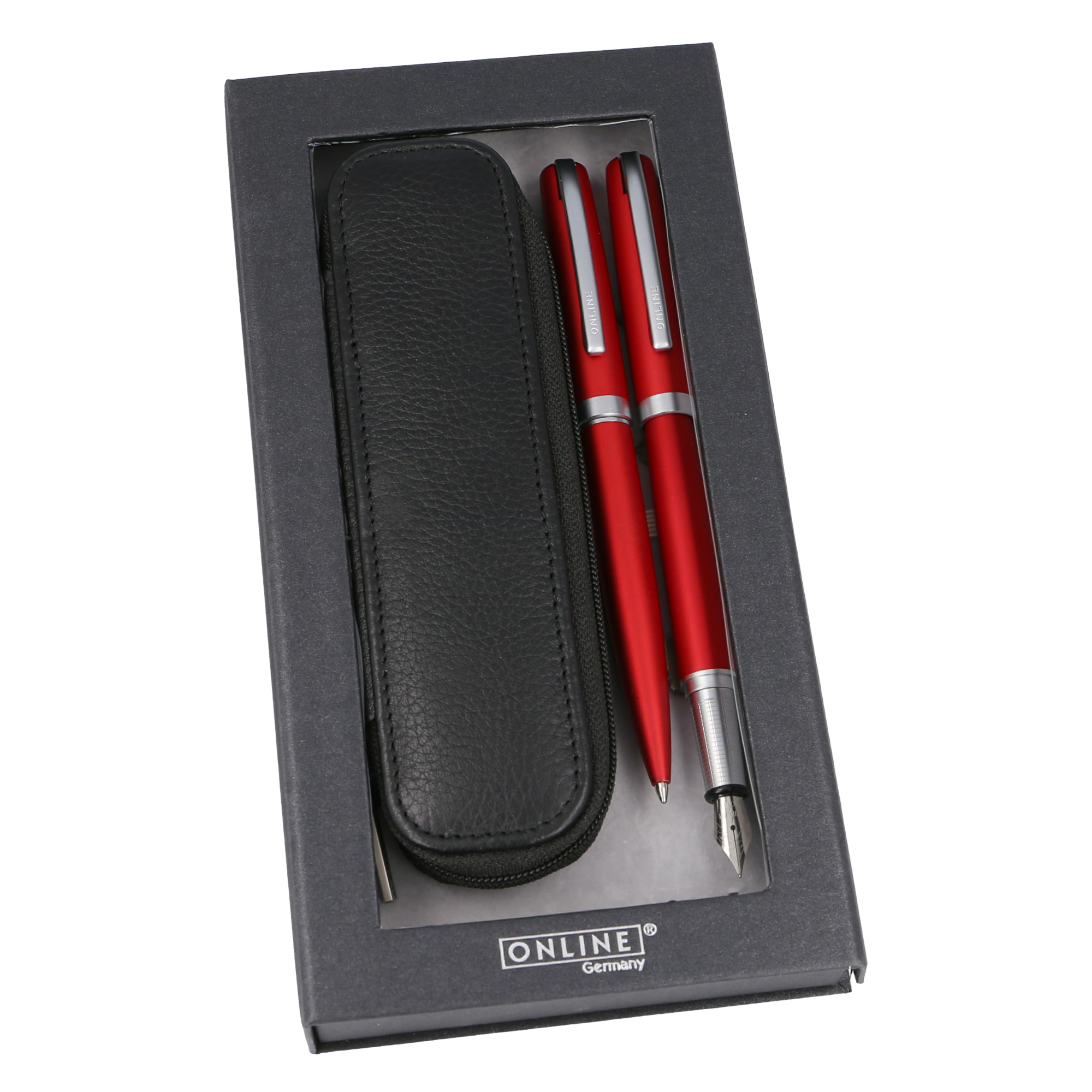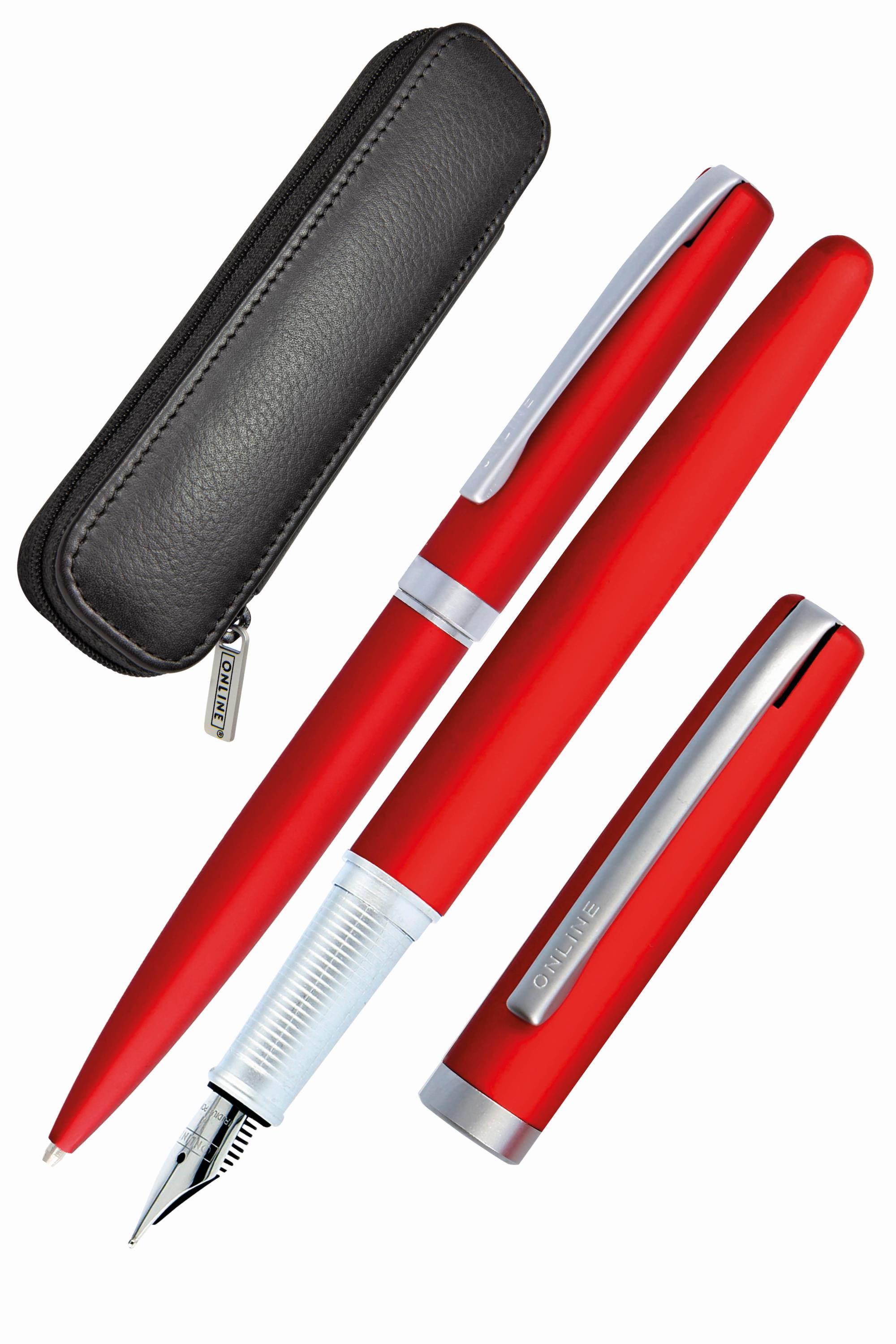 Das Eleganza Geschenkset von ONLINE, Metall-Füllhalter und Kugelschreiber, in ausgewogenem Design. Der Eleganza Füllhalter ist ausgestattet mit einer hochwertigen Iridium-Feder M (mittel). Nachfüllbar mit Standard Tintenpatronen (zwei kurze Patronen oder eine lange), Konverter-Einsatz möglich. Der Kugelschreiber enthält die hochwertige Original ONLINE Großraummine, Schreibfarbe Schwarz, nachfüllbar. Dieses Schreibgeräte-Set garantiert Schreibvergnügen pur.Zusammen mit einem hochwertigen Echtleder-Etui verpackt ist dieses Set die perfekte Geschenkidee.