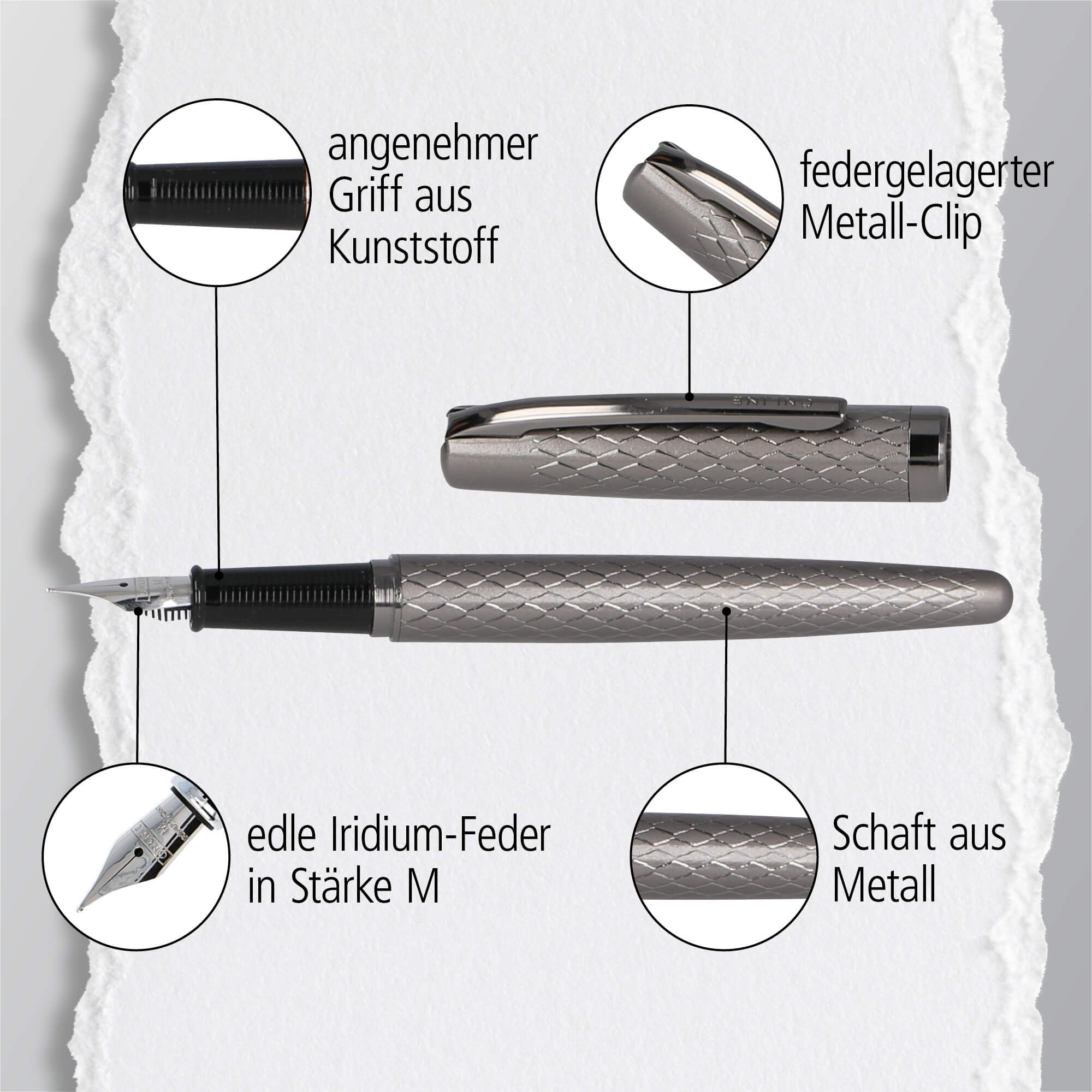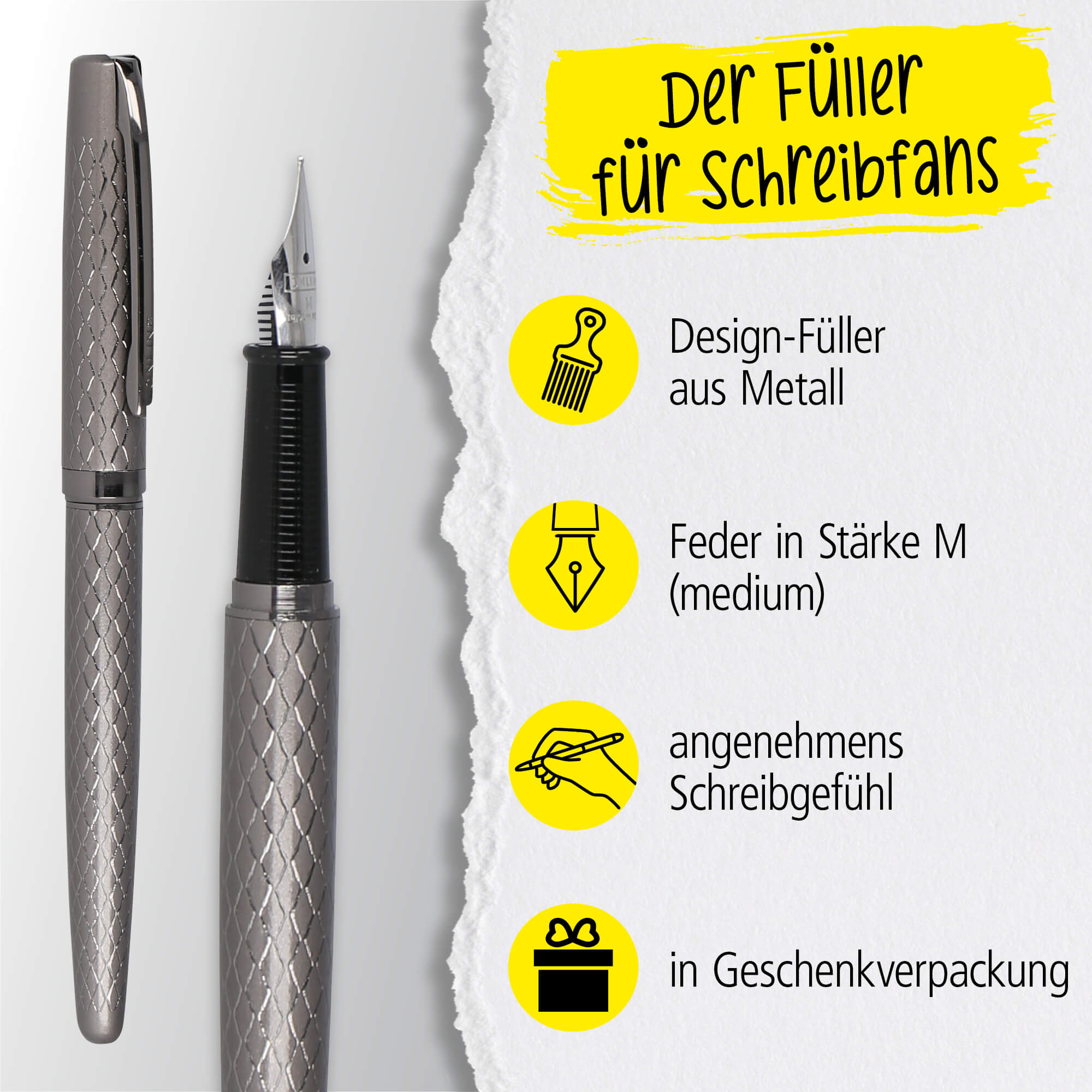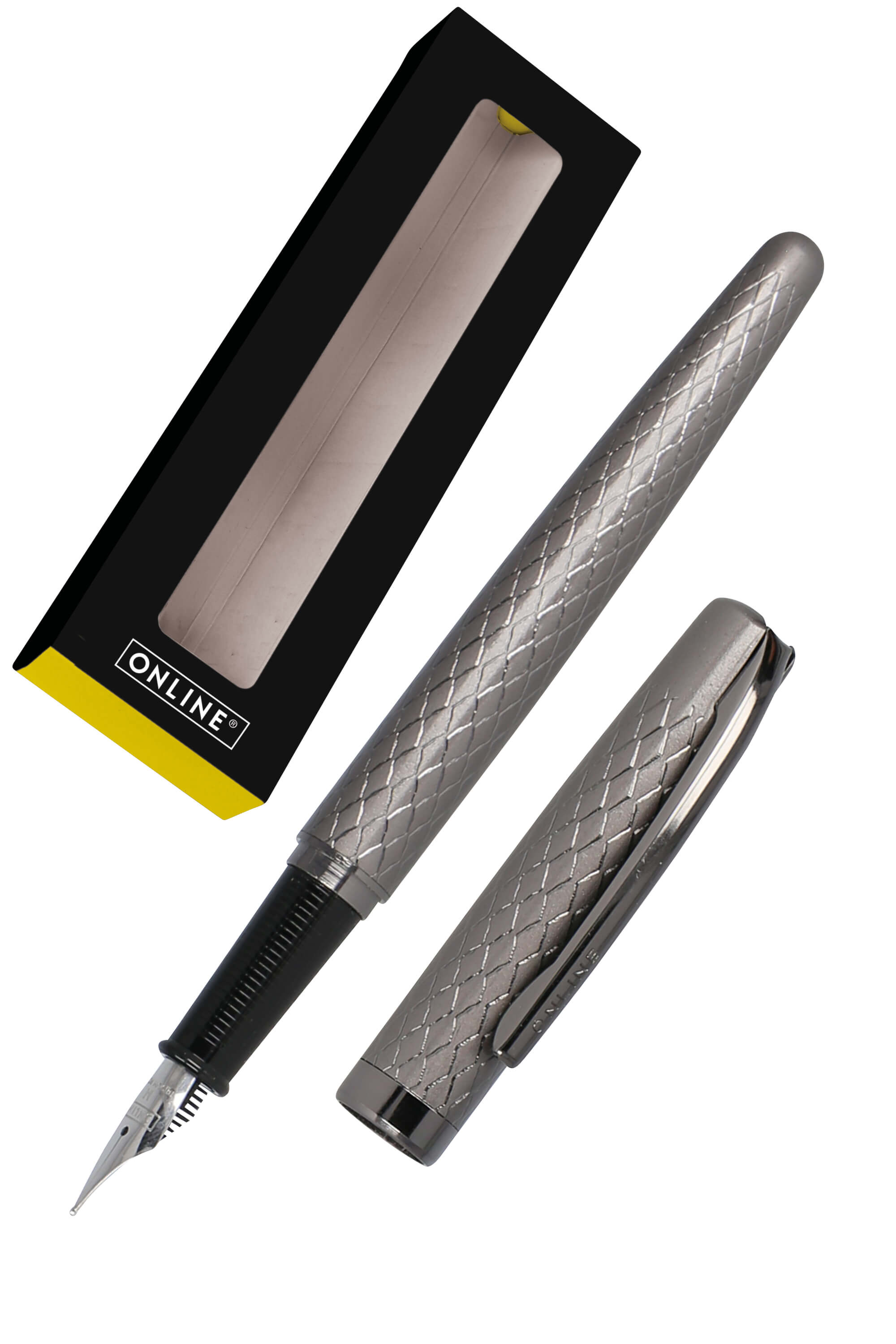 Der Design-Metall-Füllhalter von ONLINE, ausgestattet mit einer eleganten Feder M (mittel) bietet höchsten Schreibkomfort. In einer Geschenkbox ist jedes dieser Schreibgeräte eine elegante Geschenkidee.