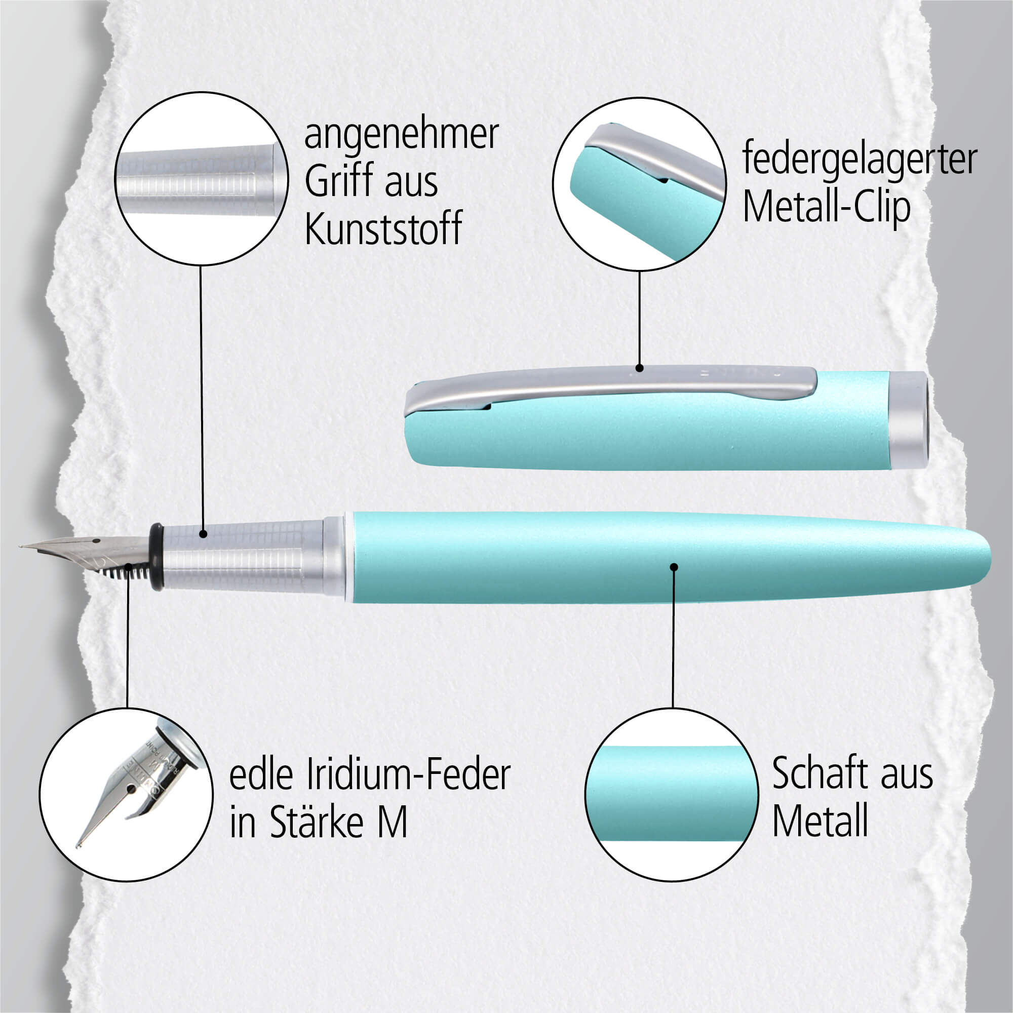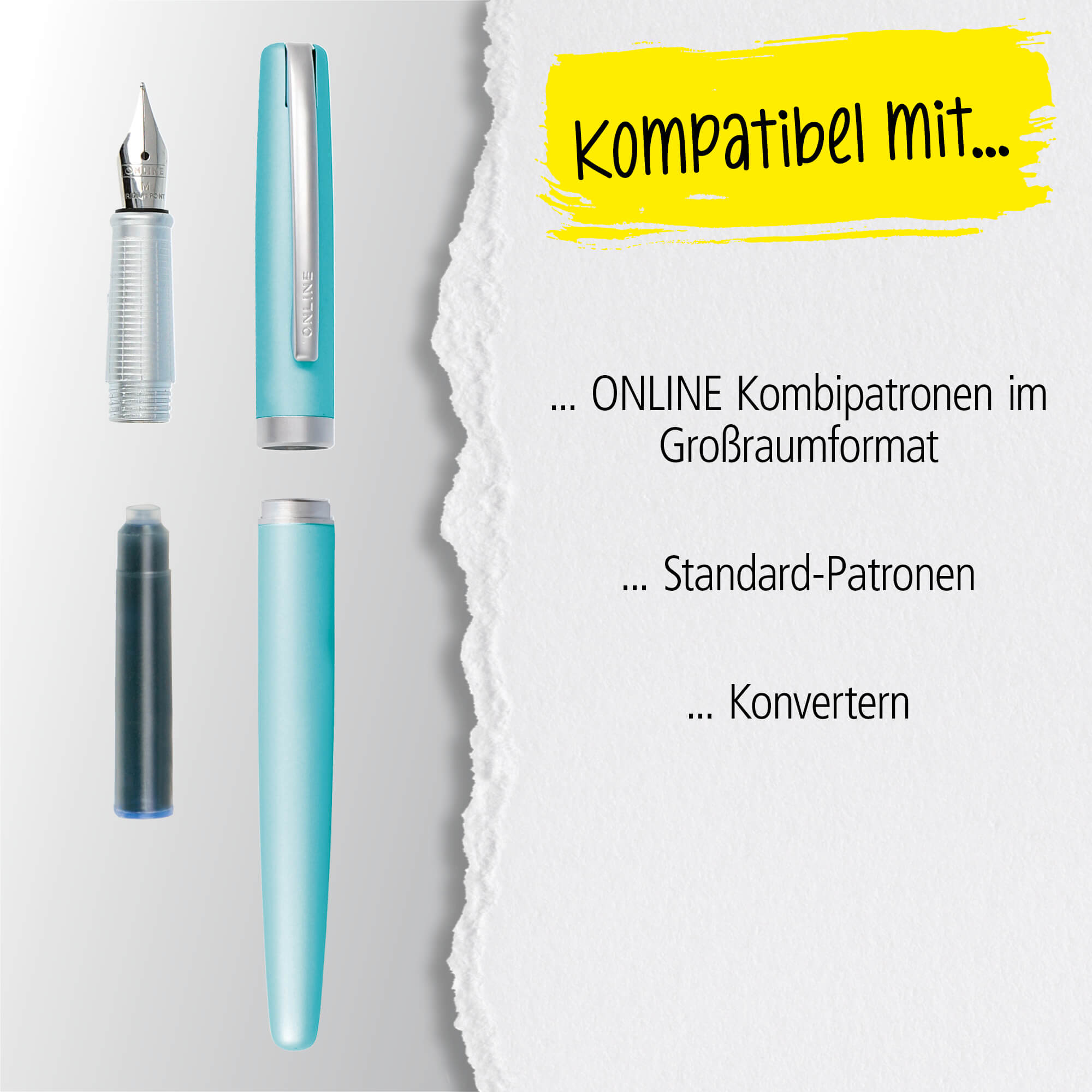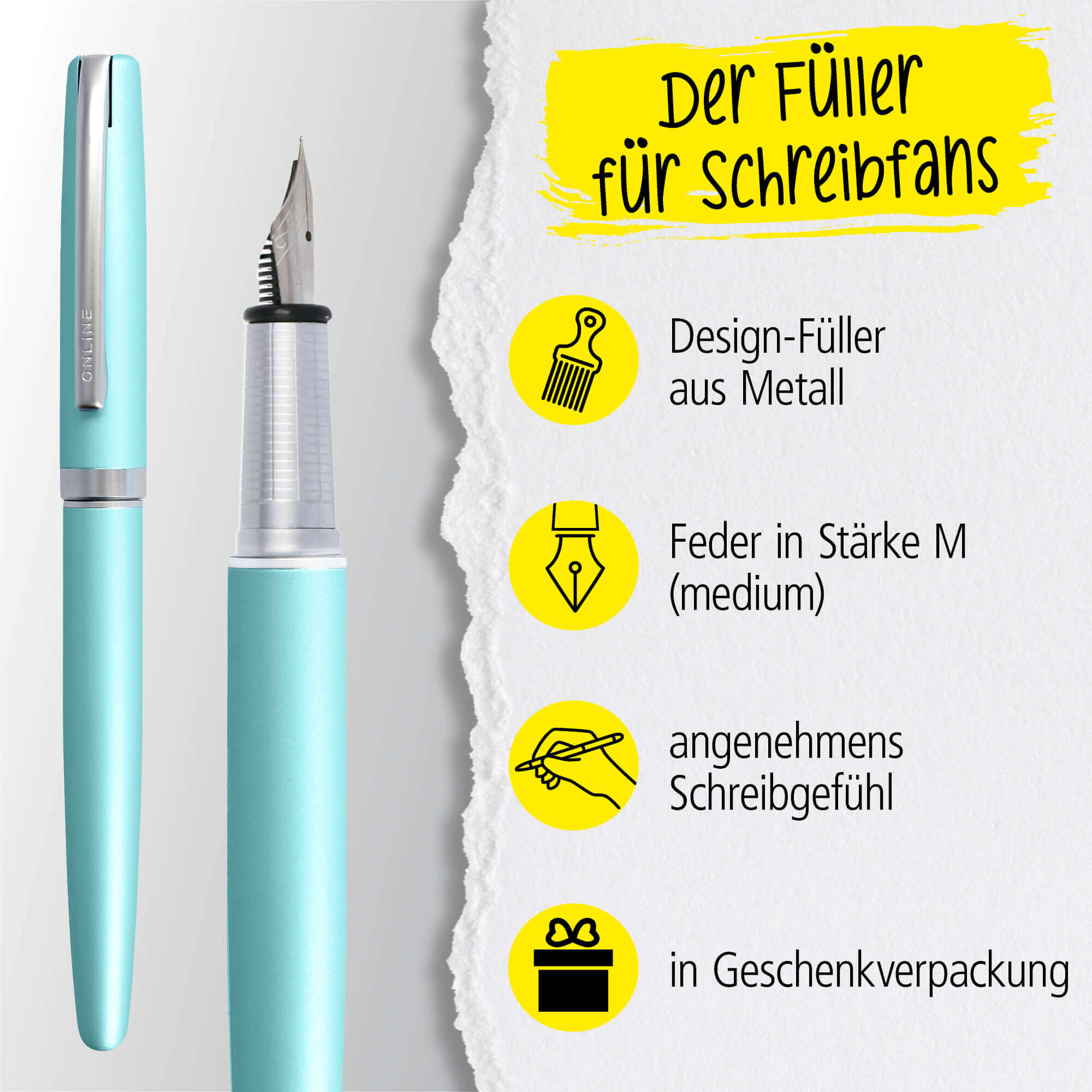Der Design-Metall-Füllhalter von ONLINE mit mattierter Oberfläche. Ausgestattet mit einer eleganten Iridium-Feder M (mittel) bietet der Füller höchsten Schreibkomfort.In der mitgelieferten Geschenkbox ist jedes dieser Schreibgeräte eine elegante Geschenkidee.Nachfüllbar mit Standard Tintenpatronen (zwei kurze Patronen oder eine lange), Konverter-Einsatz möglich.