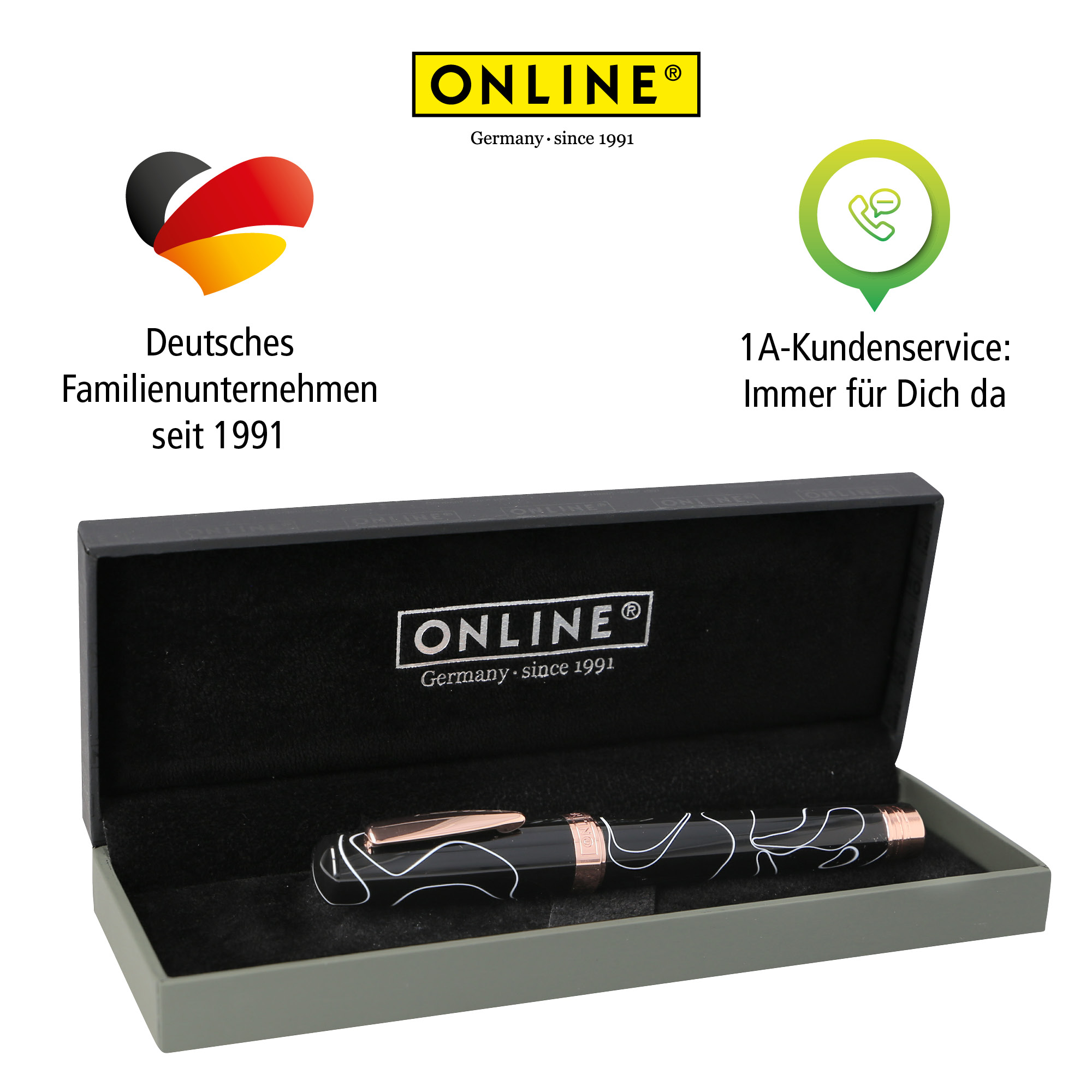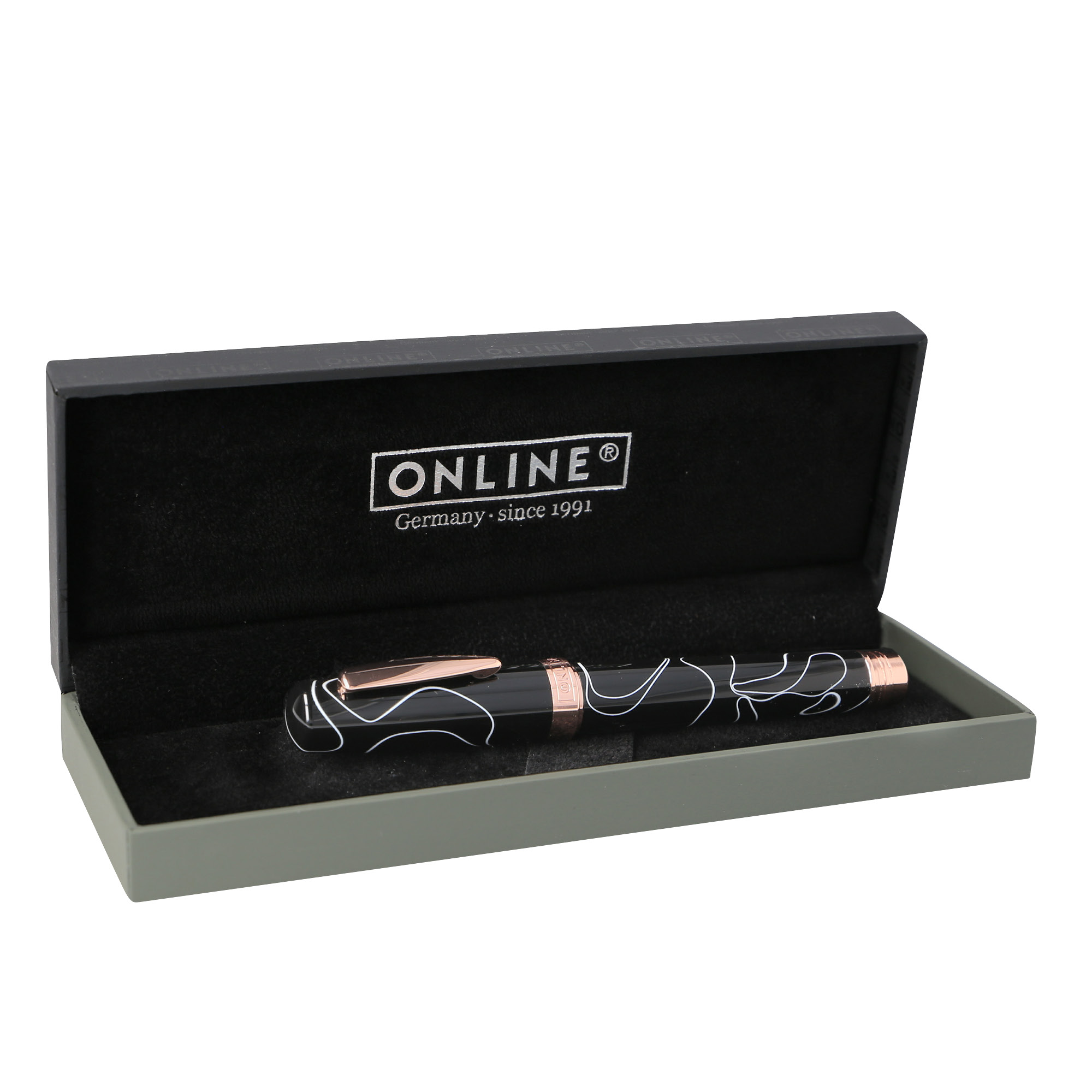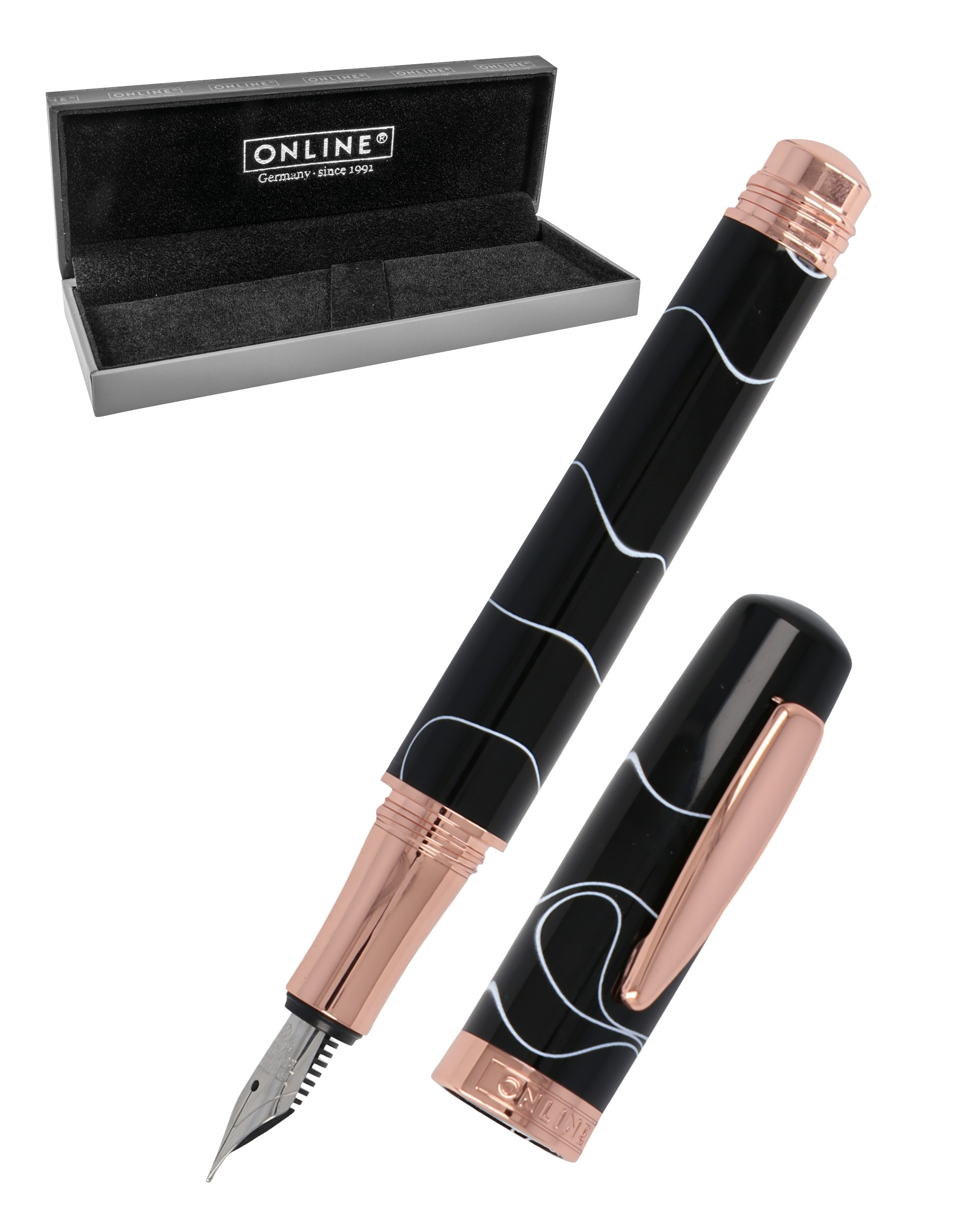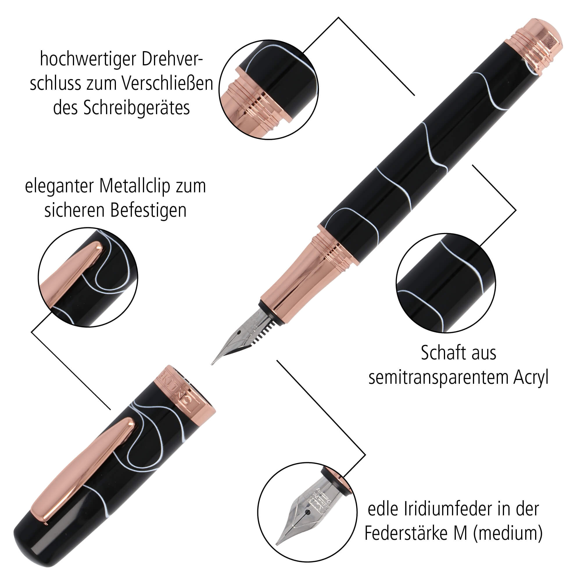 Ein edler Füllhalter aus semi-transparentem Acryl, in Midi-Größe, hochwertig verarbeitet – ganz im Stil der Boheme, einer Stilrichtung, die vor allem Künstler in den 20er Jahren mit ihrer Lebensart geprägt haben. In dieser Zeit wurde auch Acryl als Werkstoff entdeckt, aus dem heute transparente Gegenstände in den verschiedensten Bereichen gefertigt werden. Der Füllhalter wird Stück für Stück von Hand gedrechselt. Die Metallteile sind in modischer Rosegold-Optik veredelt. Durch das interessante Acryl ist jedes Stück ein Original. Hochwertig verarbeitete Kappe mit Drehverschluss, auch zum Verlängern des Schafts. Die Geschenkbox passt exakt zum Boheme Stil und macht den Füllhalter zum perfekten Geschenk für alle Retro-Fans.Nachfüllbar mit Standard Tintenpatronen, Gebrauch eines kurzen Konverters möglich. Für den persönlichen Schreibkomfort leicht auswechselbare Federn durch „Easy-Change-System“