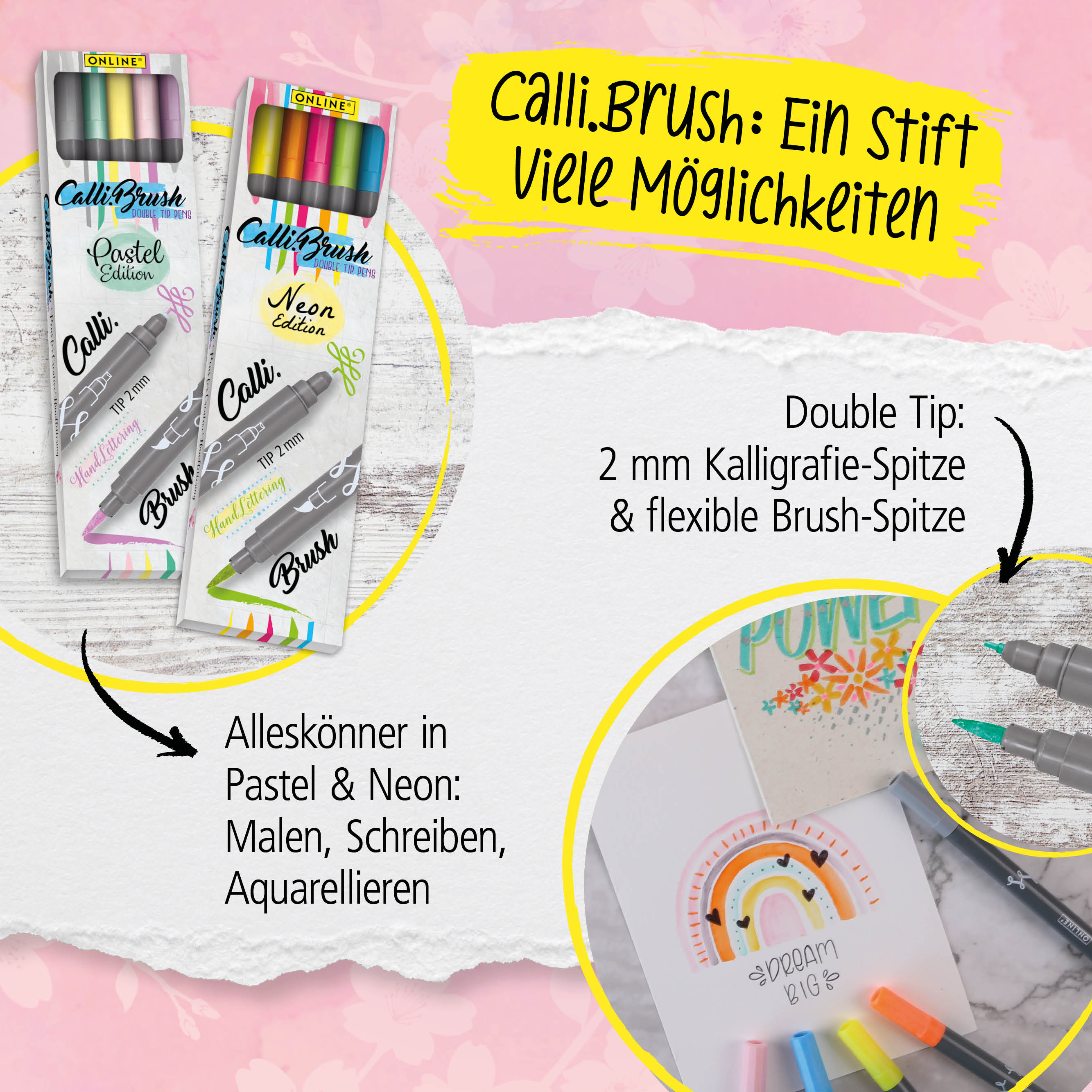 Die Calli.Brush Double Tip Pens für kreatives Schreiben haben eine 2 mm dünne Kalligrafie-Spitze und eine breite Pinsel-Spitze zur vielfältigen Gestaltung und zum Colorieren von Motiven. Die Tinte auf Wasserbasis ist auswaschbar aus fast allen Textilien. Im Geschenk-Set enthalten sind zwei 5er Sets in den Farbgruppen Neon und Pastel.
