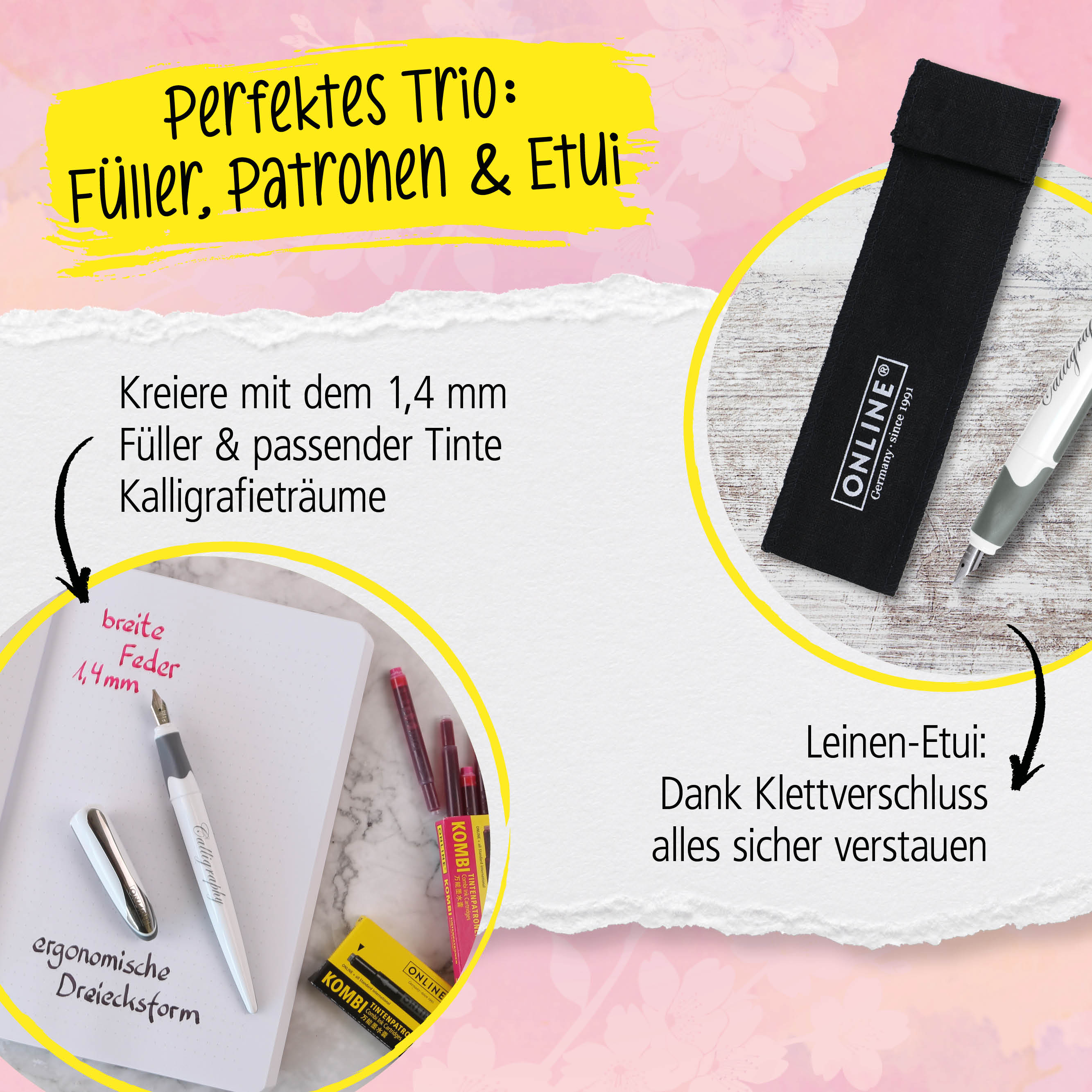 Der Schönschreibfüller ONLINE Best Writer ist leicht und ergonomisch, hat eine edle Kalligrafie-Feder in der Strichstärke 1,4 mm und schreibt mit Standard-Tintenpatronen. Die softe Dreiecksform von der Kappe bis zum Schaft sorgt für eine ganz besondere Haptik. Das ergonomische Griffstück liegt gut in der Hand und garantiert entspanntes Schreiben.
