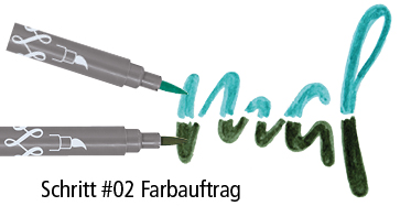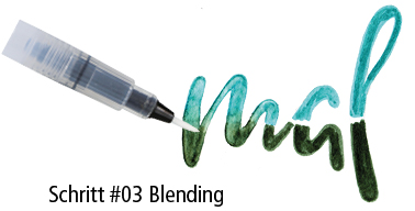 Trage nun die Farbpigmente mit der Brush-Spitze des Calli.Brush Pens auf. Lass dabei kleine Weißräume zwischen den einzelnen Farben. Halte den Stift dabei so flach wie möglich um die Pinselspitze zu schonen.