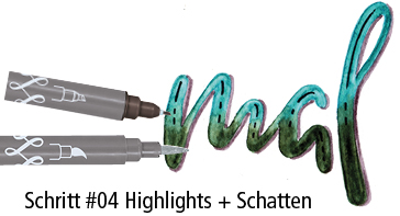 Mit der Calli-Spitze des Brush Pens zeichnest du Highlights auf die Buchstaben. Mit der grauen Pinselspitze setzt du nach rechts und unten einen Schatten.