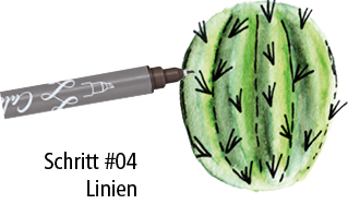 Mit der Calli-Spitze des Brush Pens zeichnest du die Stacheln des Kaktus und ein paar unterbrochene Linien für mehr Struktur in deiner Aquarell-Illustration.