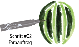 Mit der feuchten, nicht all zu nassen Spitze des Water Brushpens aktiviere zunächst die Farbstoffe (“Pigmente“) mit kreisenden Bewegungen. Beginnend mit der helleren Farbe vermalst du nun Flächen ineinander.