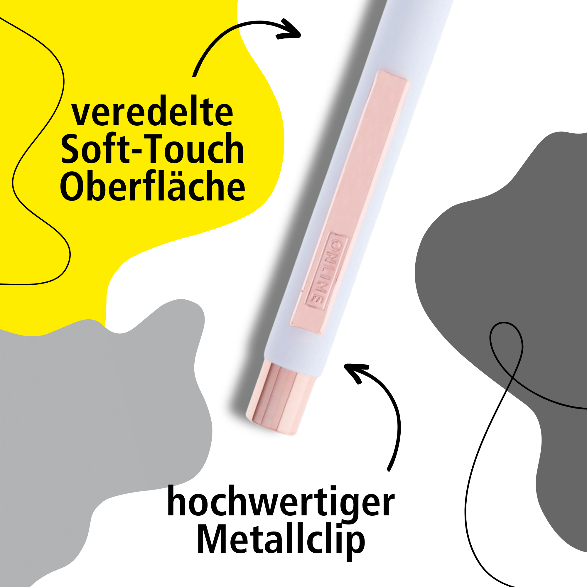 Der Design-Kugelschreiber Soft Metal von ONLINE überzeugt mit seiner angenehmen Oberfläche mit Softtouch-Feeling und garantiert Schreibvergnügen pur. Hochwertige Details, wie der Clip aus Metall, runden das Design ab. Ausgestattet mit einer internationalen Großraummine, Schreibfarbe Blau ist der stylische Kugelschreiber für jeden Einsatz bereit.