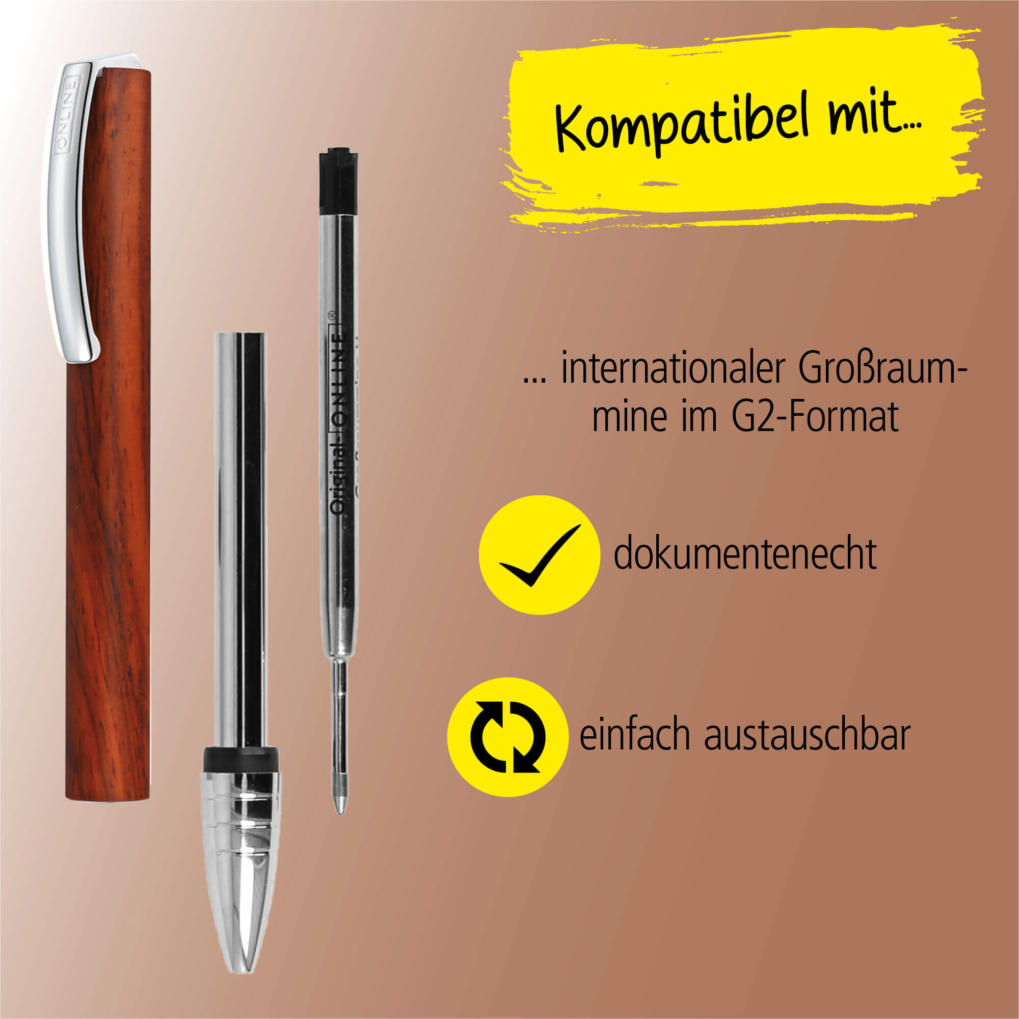 HOCHWERTIGE MINE: Um einen leichten Austausch zu ermöglichen, ist der Drehkugelschreiber mit einer Großraummine im Standardformat G2 und Edelstahlspitze ausgestattet. Dokumentenecht in schwarz schreibend und in Strichstärke medium.