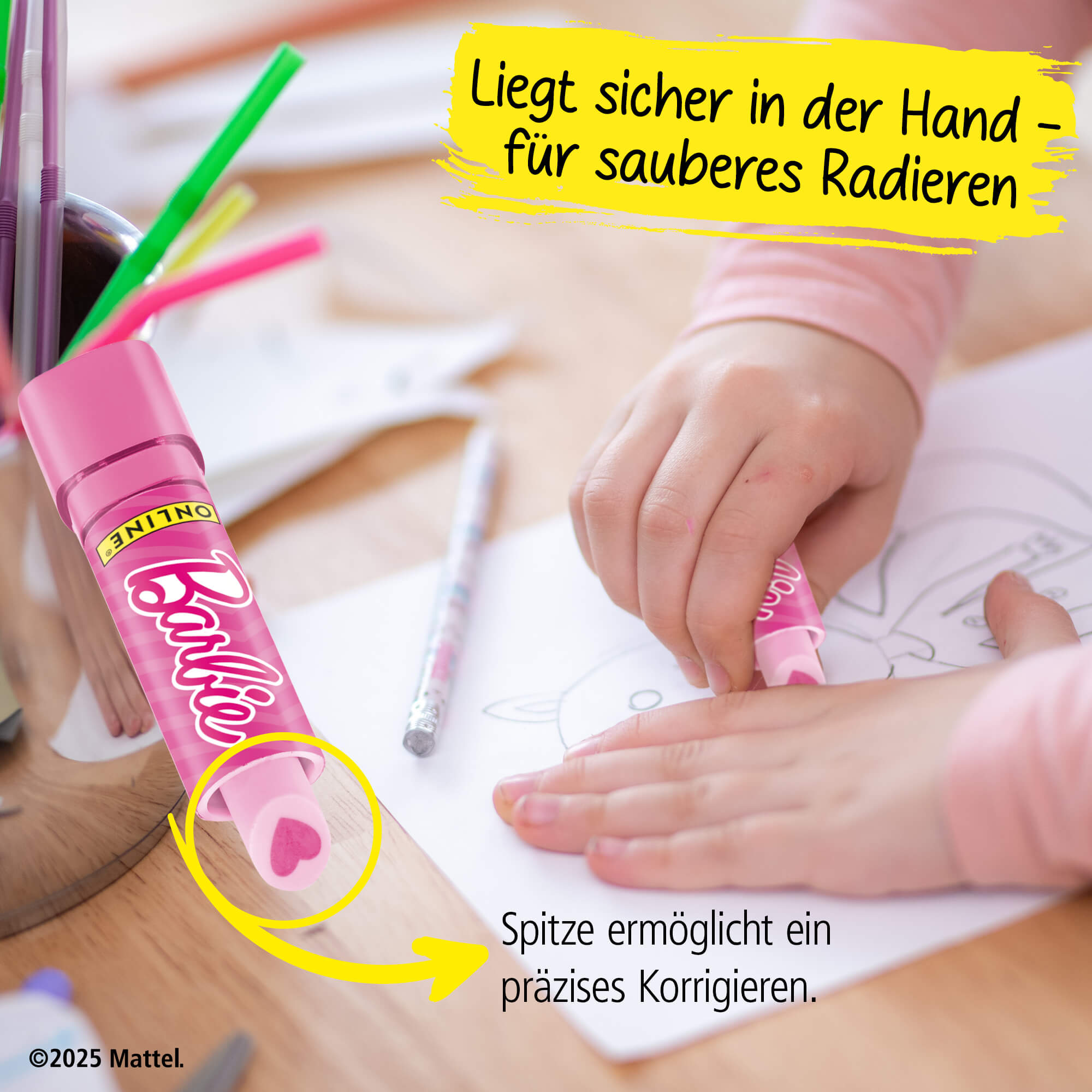 Dein neuer Lieblings-Radierer: Die Barbie Radiergummis von ONLINE bringen Glamour ins Federmäppchen. Gestaltet wie ein Lippenstift und mit Glitzerdeckel, sind sie ein echter Hingucker in jedem Schulranzen.
