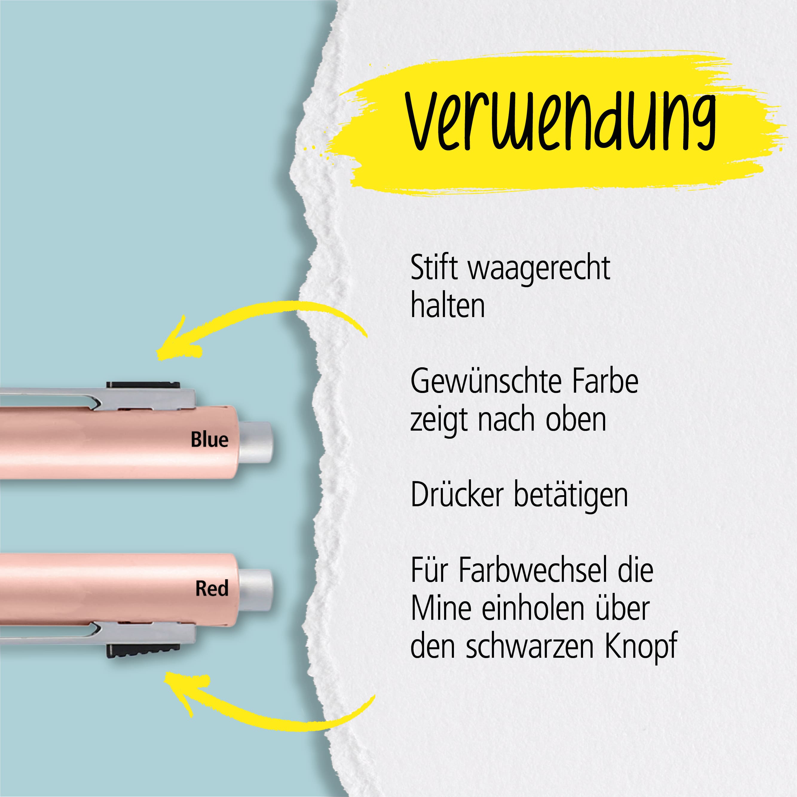 Der schicke 4-in-1 in Rosegold sieht aus wie ein Kugelschreiber und ist doch viel mehr. Drei Kugelschreiber-Farben sowie ein Bleistift mit Radiergummi in einem. Mit einem einfachen Drehmechanismus lässt sich der Pen in die gewünschte Funktion bringen. Ein praktischer Clip fixiert den Stift in Tasche, Sakko oder Blazer.