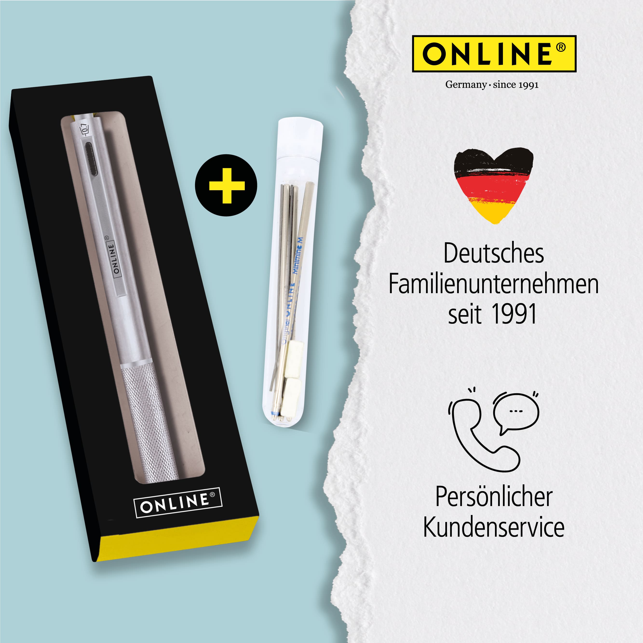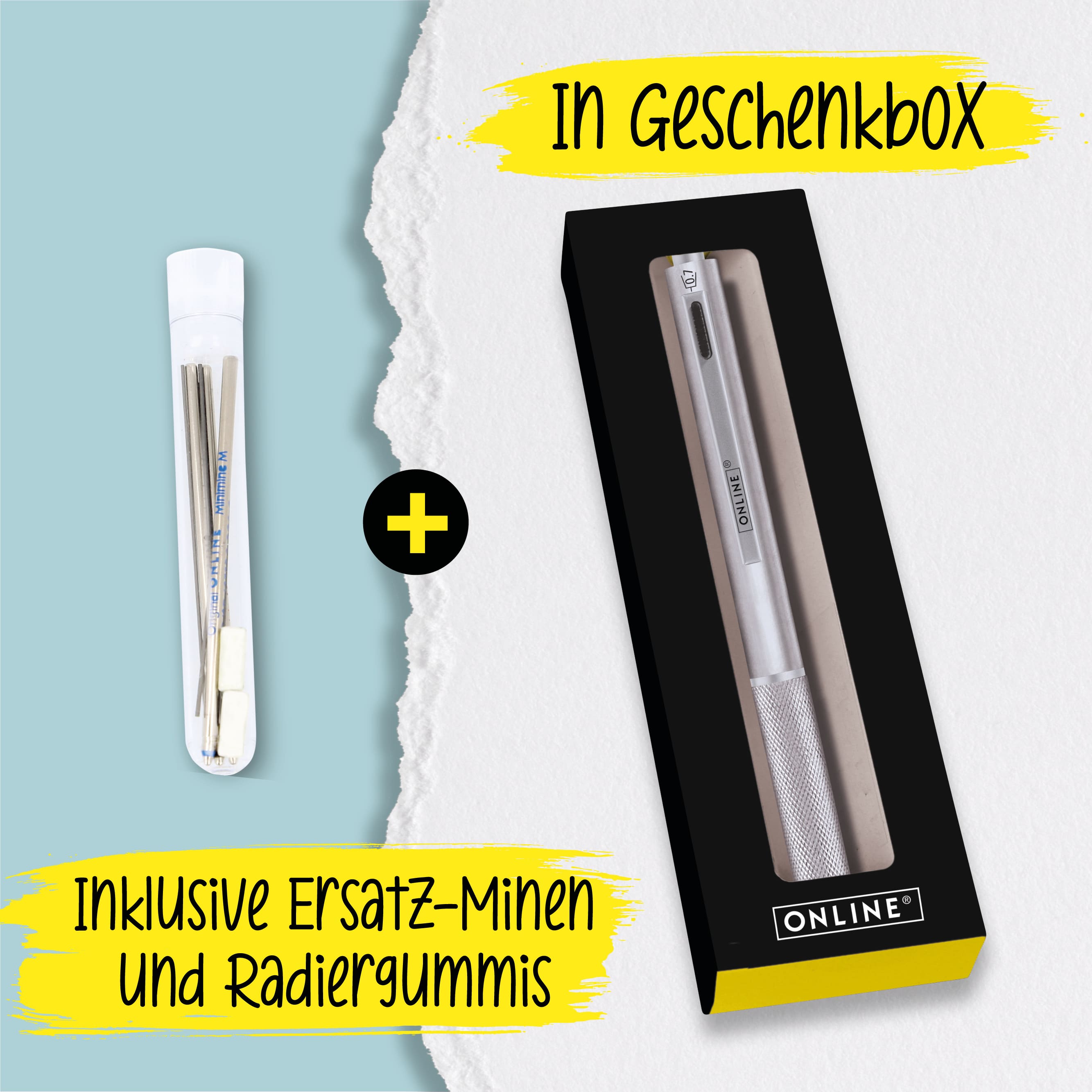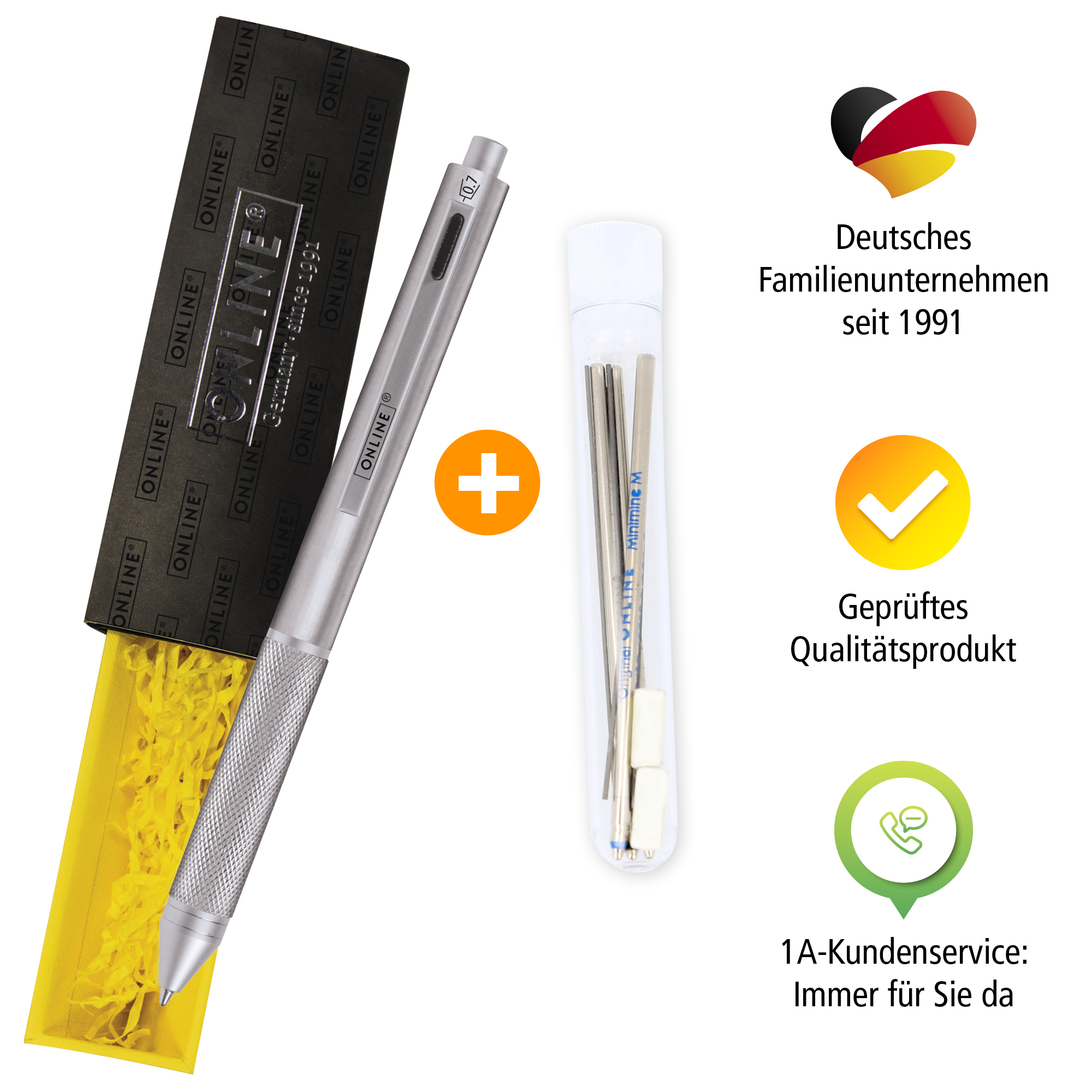 Für den Fall, dass die im Kugelschreiber verbauten D1-Minen leer geschrieben sind, ist ein Nachfüllset im Lieferumfang enthalten. Das Ersatzteile-Set besteht aus je einer Kugelschreibermine in den Farben blau, schwarz und rot, fünf Ersatz-Bleistiftminen sowie zwei Radiergummis.