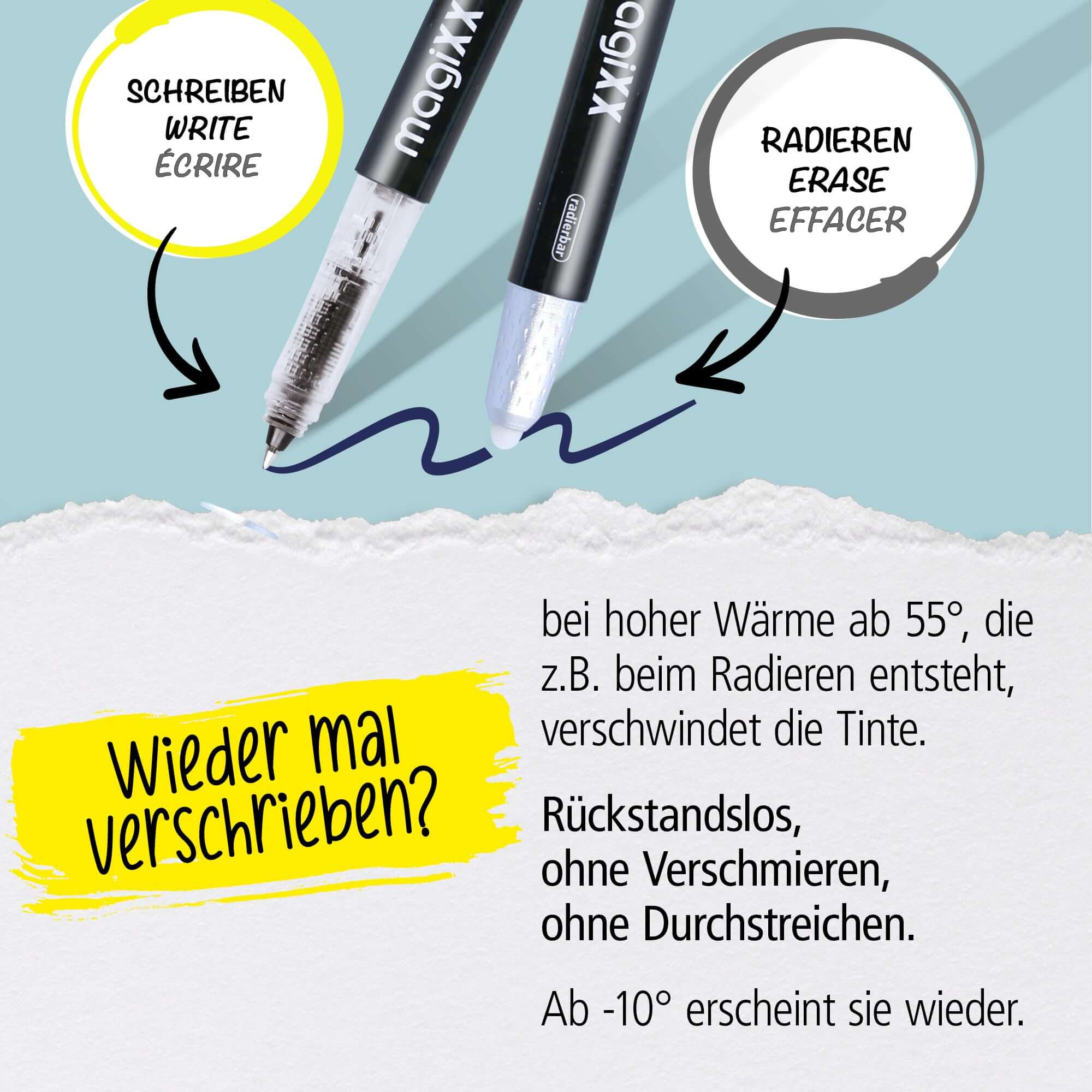 Radierbare Tinte: Durch Reibung lässt sich die Tinte rückstandsfrei radieren und sofort wieder überschreiben. Kleine Fehler lassen sich so schnell und sauber korrigieren.