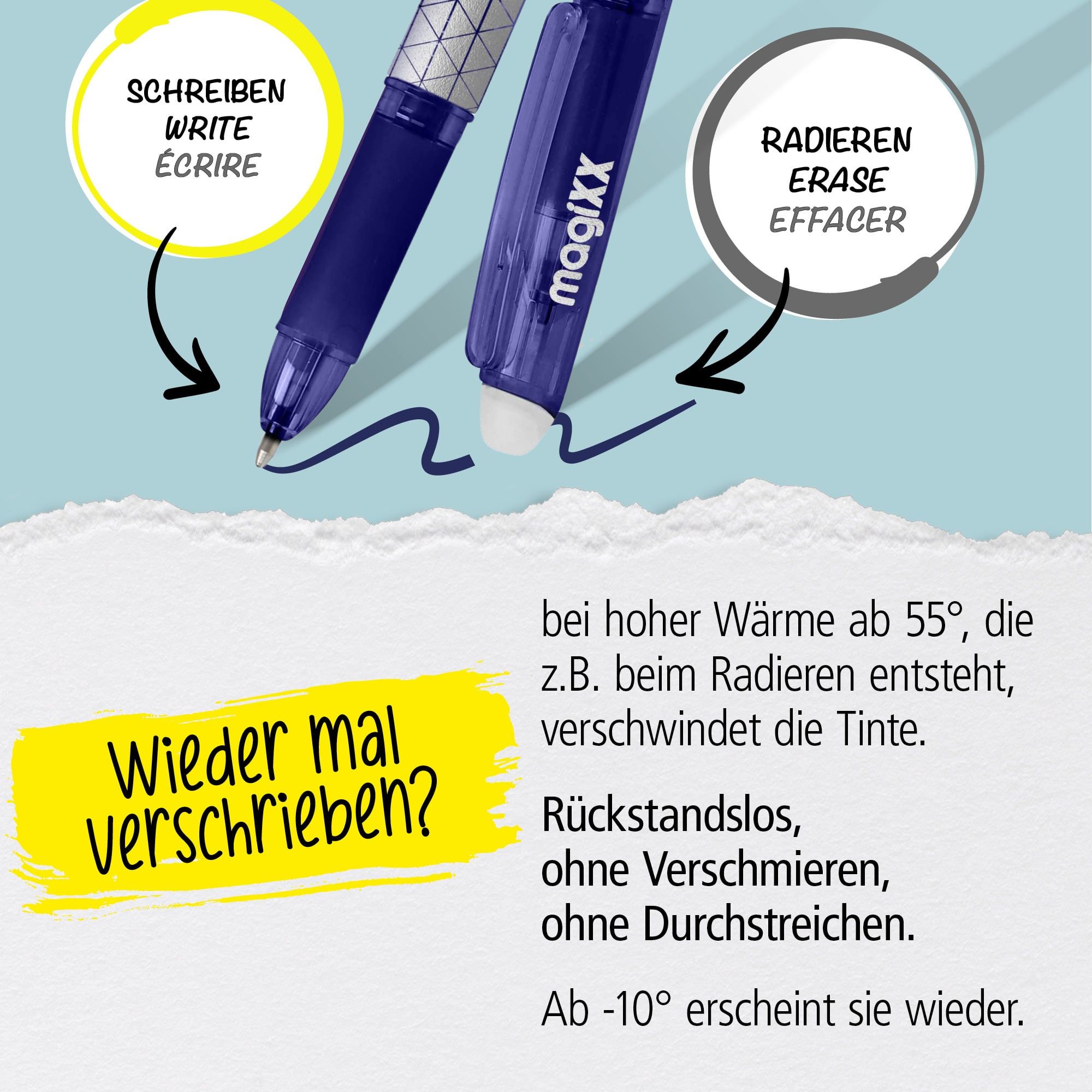 Unsere löschbaren Gelstifte ermöglichen ein müheloses Wegradieren von kleinen Fehlern, ohne Verwischen der Tinte. Die Magixx radierbare Gelschreiber geben konstant und gleichmäßig Gel-Tinte ab, die sich vollständig wegradieren lässt. Für eine saubere Schrift und zuverlässige Fehlerkorrektur.