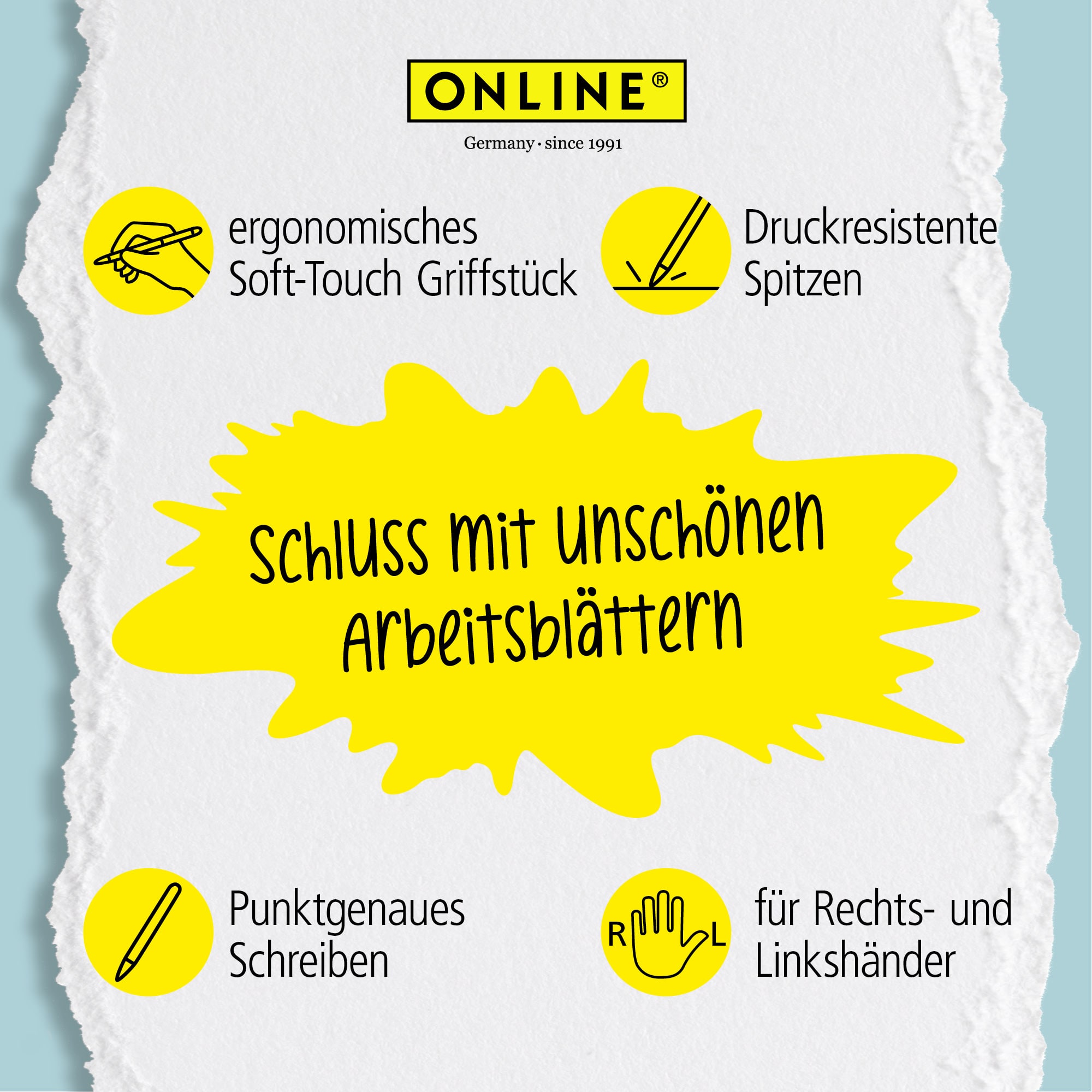 Tolles Schreibgefühl: Gleichmäßiger Tintenfluss & konstante Farbe sind bei ONLINE Gelstiften der Standard. Aussetzfreier Schreibfluss ohne Kratzen. Gummiertes, ergonomisches Griffstück für festen Grip & angenehmes Halten, ohne schnelles Ermüden. Die Stifte zum Wegradieren sind geeignet für Rechts- und Linkshänder.