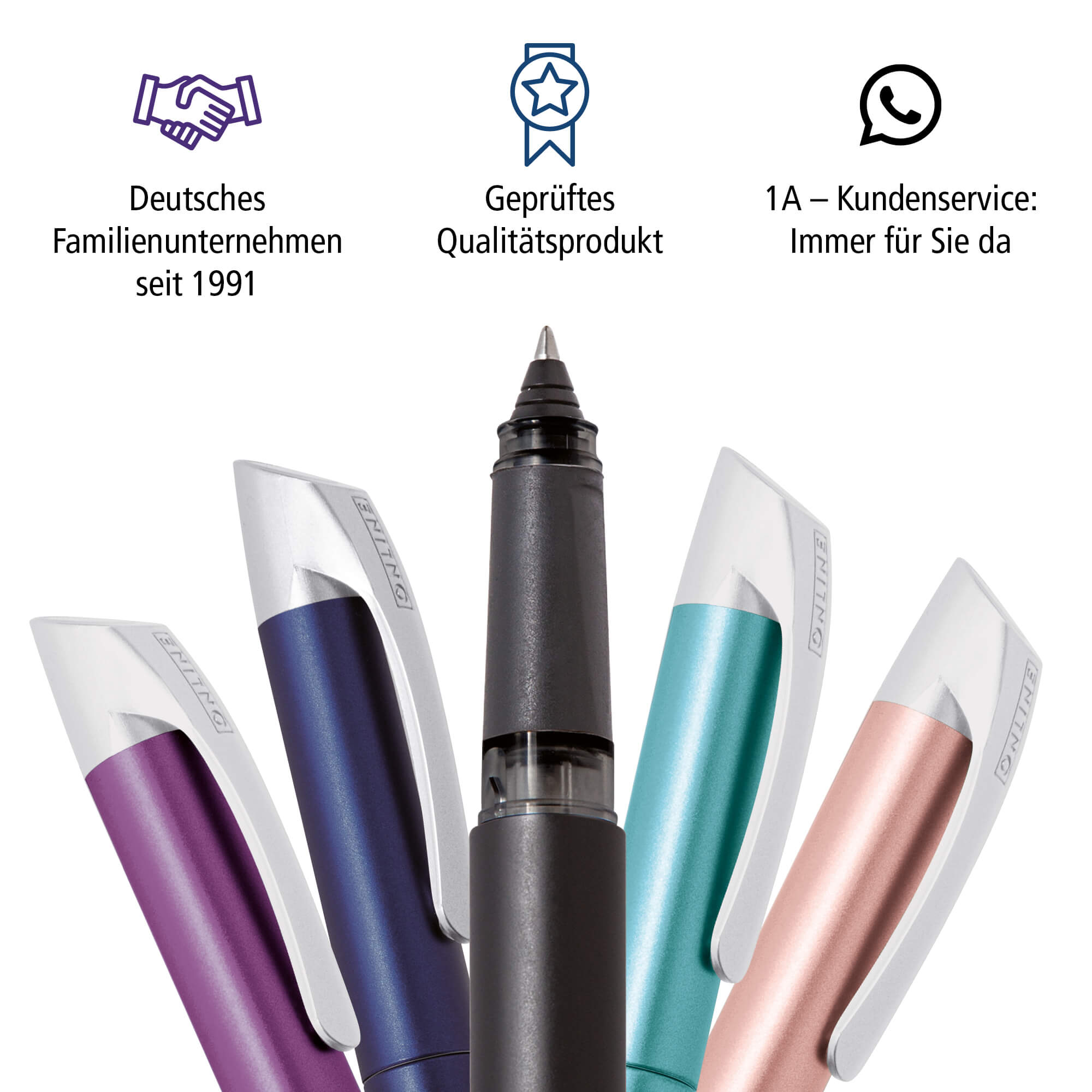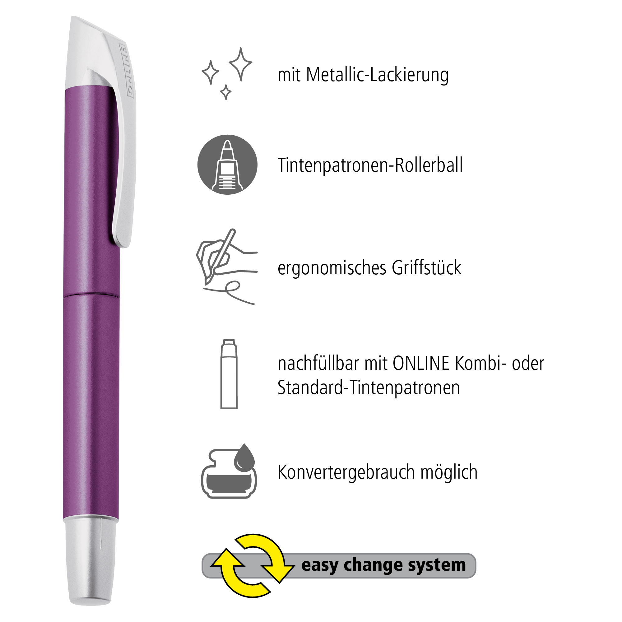 Colour up your personal style! Der erfolgreiche Campus Colour Line in aktuellen Fashion-Farben wie Turquoise, Rosegold oder Lilac – oder als Klassiker immer gefragt in dynamischen Blue und Soft Black. Die Speziallackierungen in Metallic bringen die angenehme Haptik auf den Schaft. Der neue Campus Tintenpatronen-Rollerball überzeugt als hochwertiges Lifestyle-Schreibgerät: Die verbesserte Qualität des Magic Balls sorgt für lange Lebensdauer und flüssigeres Schreib-Feeling. Das Softtouch-Griffstück unterstützt zusätzlich die Ergonomie und bietet besonders entspannten, weichen Schreib-Komfort – speziell auch für Linkshänder. Nachfüllbar mit ONLINE Kombipatronen oder Standard-Tintenpatronen.