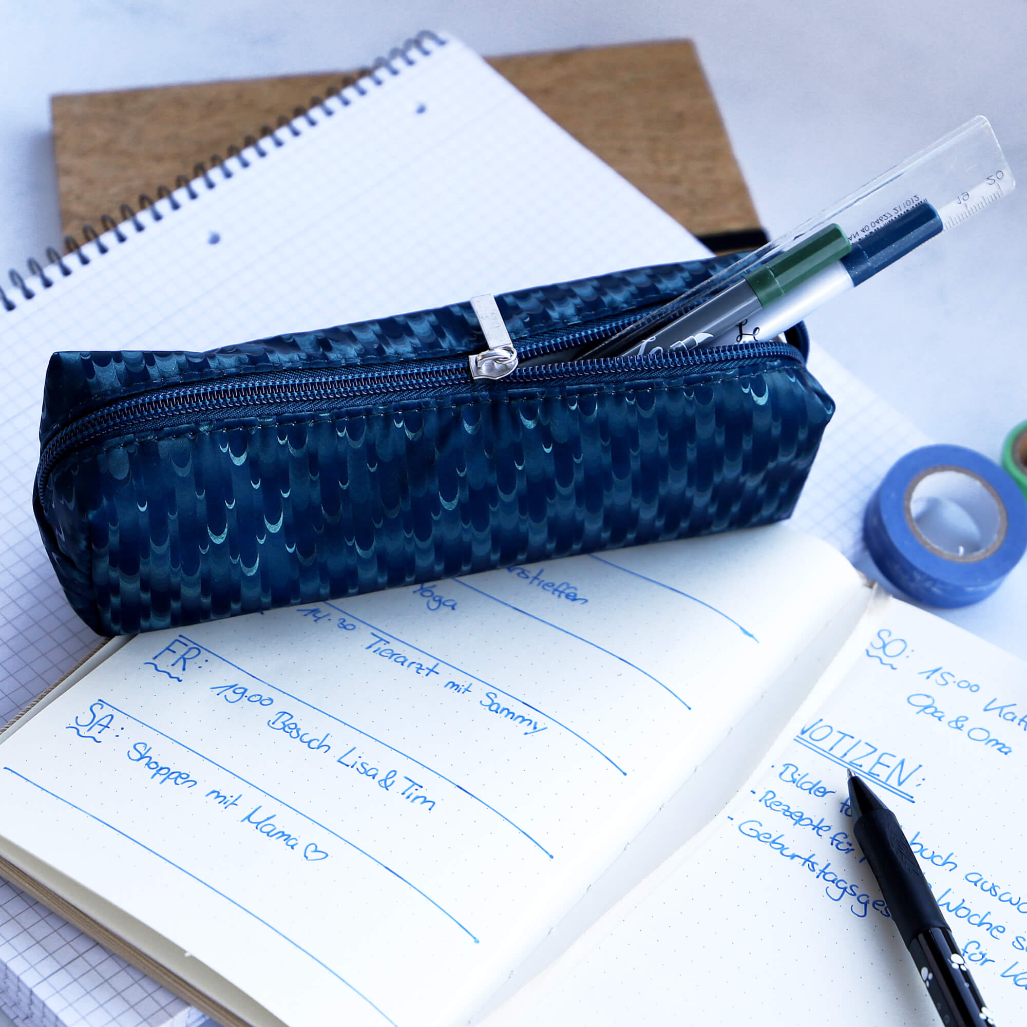 Schlamperetui im blauen Tropfen Design. Dank der besonderen Oberfläche lassen sich die Tropfen spüren.