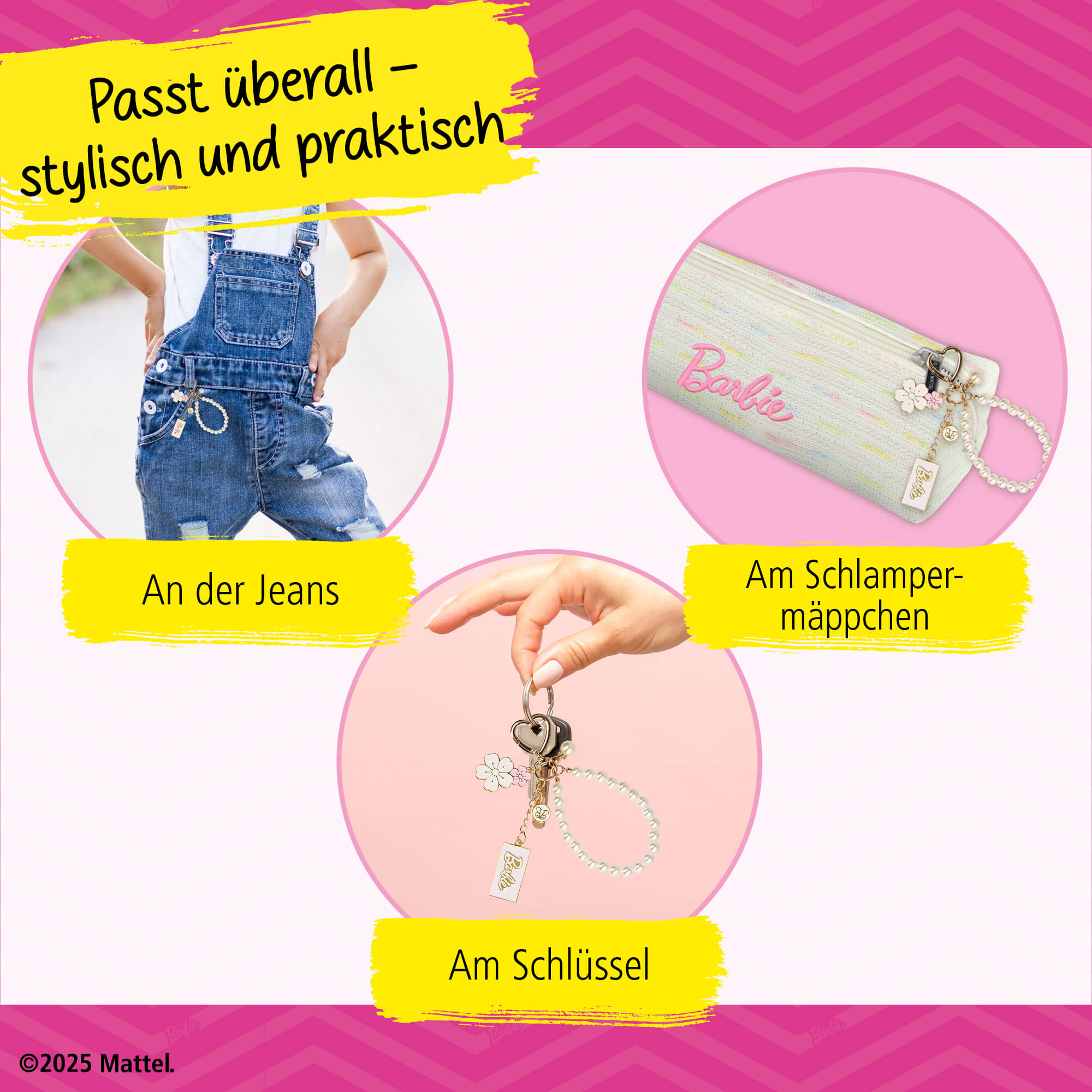 Style it with Barbie: Der Barbie-Schlüsselanhänger peppt Alltagsgegenstände im Handumdrehen auf – ob als Auto-Schlüsselanhänger, Bag Charm oder Anhänger für den Schulranzen. Mit den in zwei Varianten erhältlichen Barbie-Designs wird jedes Teil zum stylischen Blickfang.