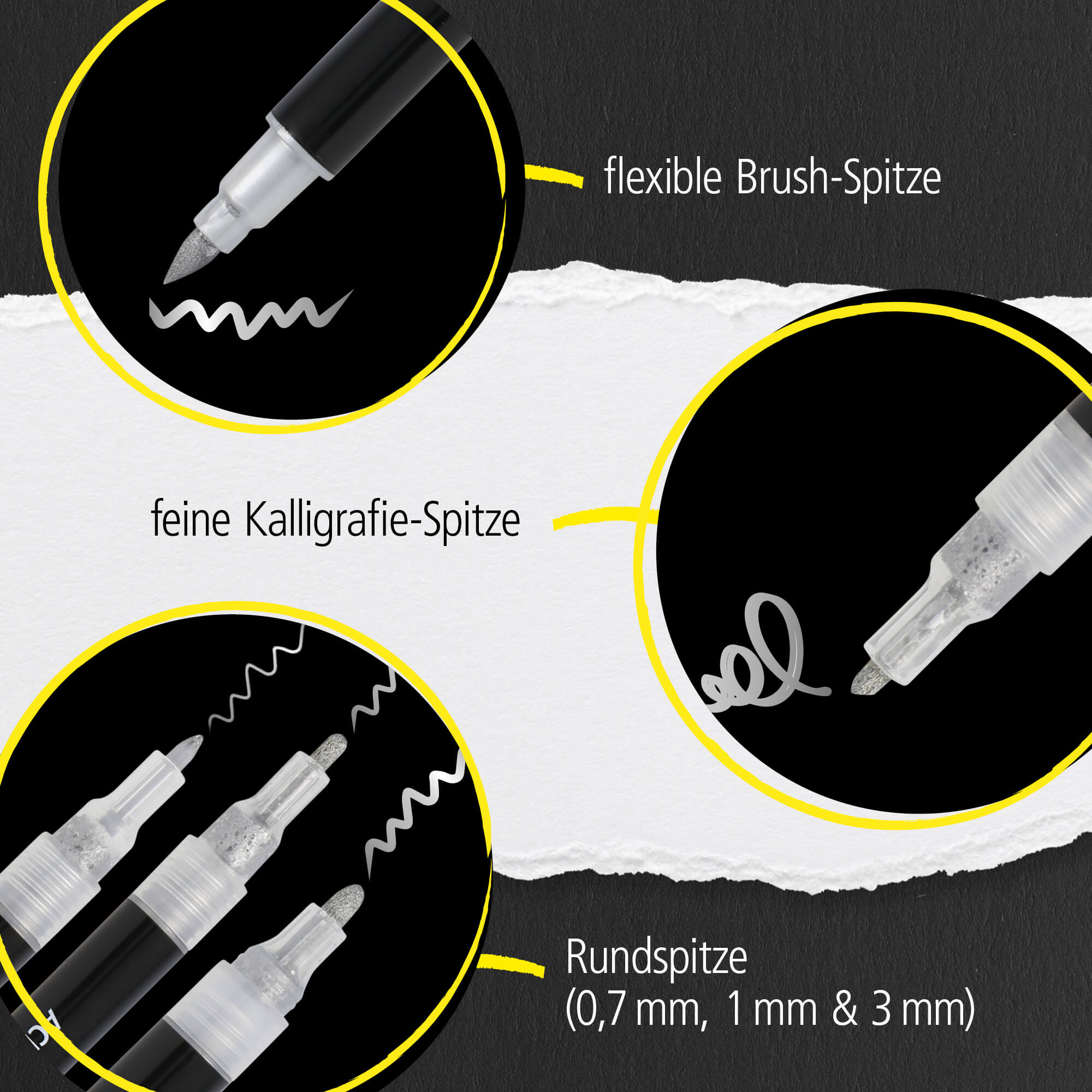 Robust & vielseitig: Die silbernen Lettering-Marker schreiben auf fast allen Materialien. Sei es Papier,