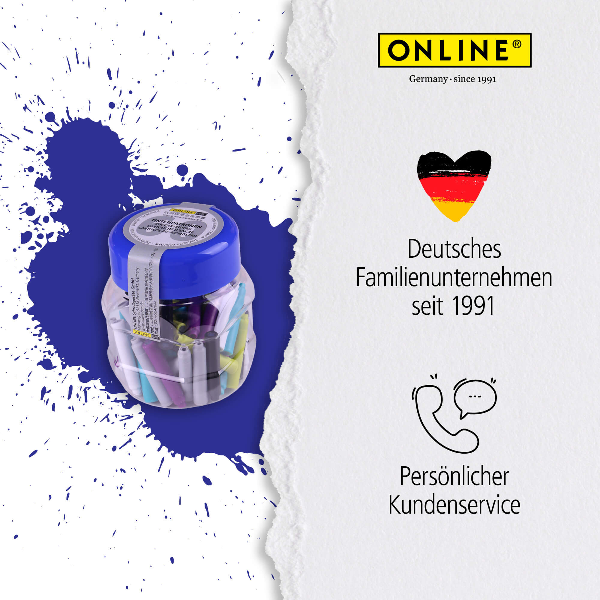 Die Füllhalter-Standard-Tintenpatronen von ONLINE garantieren hochwertige Tinte und intensive Schreibfarbe – Schreibfarbe königsblau, löschbar – in gleichbleibender Qualität.