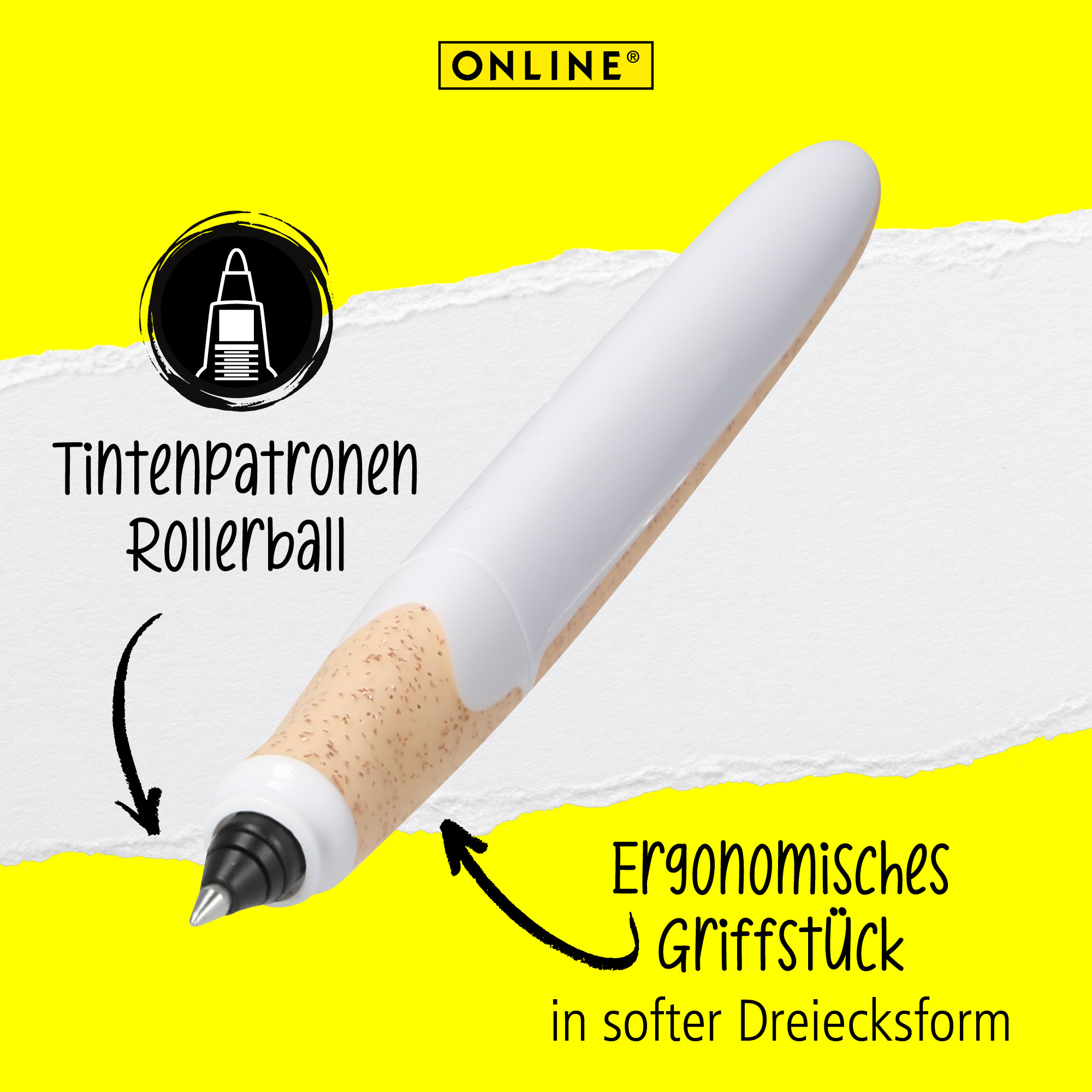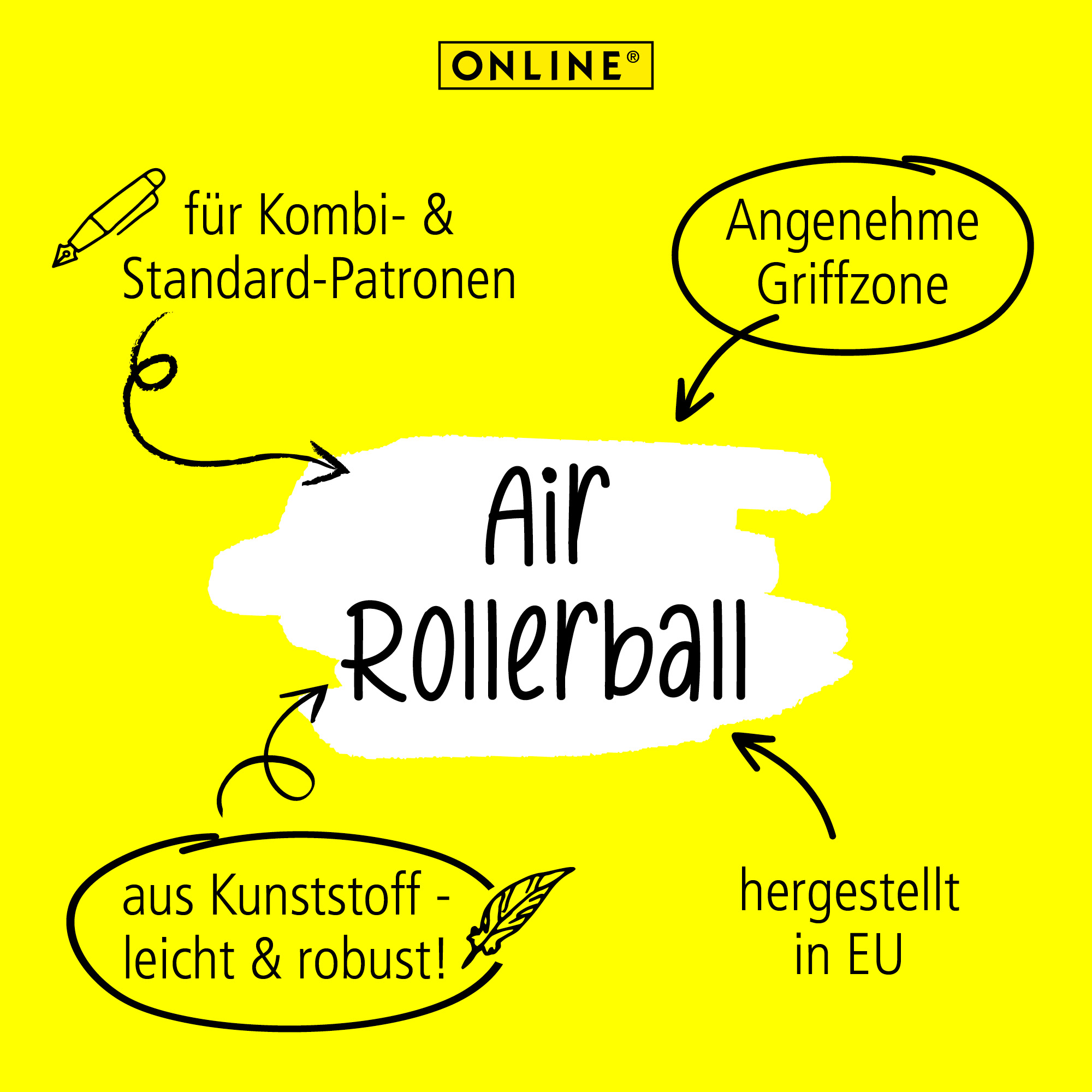 Der ONLINE AIR – der innovative Design-Rollerball. Von Kappe bis zum Schaft überzeugt die softe Dreiecksform ebenso wie das hochwertige, ergonomische Griffstück. Mit dem ONLINE AIR wird Schreiben zum puren Vergnügen ob in der Schule, im Office oder rund um den privaten Schreibtisch zuhause. Sowohl die hochwertige Ausführung des gesamten Rollerballs als auch die edle Magic Ball stehen für die nachhaltige, sorgfältige Qualität des Schreibgerätes, die der stabile Metallclip unterstreicht. Nachfüllbar mit ONLINE-Kombipatronen, 2 Standard-Tintenpatronen oder Konverter.
